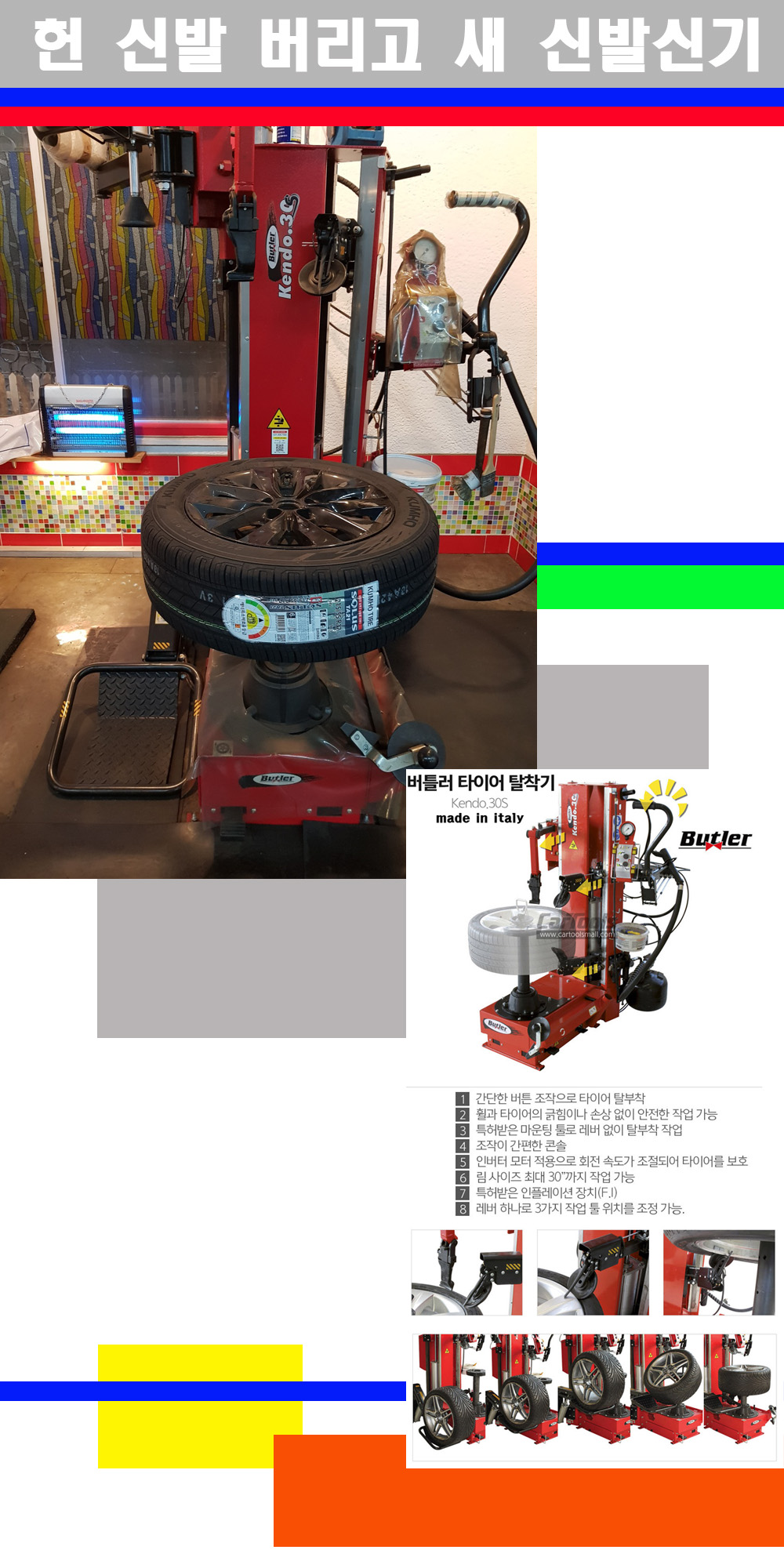이태리 버틀러사의 켄도3.0S는 휠과 타이어와 조립과 분리시 전혀 제품에 손상을 주지않는 탈착기로 특히 센터락방식(중앙에서 휠를 고정하는 방식)이여서 휠의 중앙부위 잡아서 타이어를 탈부착하고 이후 상하롤러로 타이어를 탈부착합니다 특히 유니포미티작업(휠의 가장가벼운부분과 타이어의 가장 무거운부분을 매칭시키는 작업)시 작업자가 타이어를 정확한 지점에 휠과 매칭시킬수 있는 장점도 있습니다