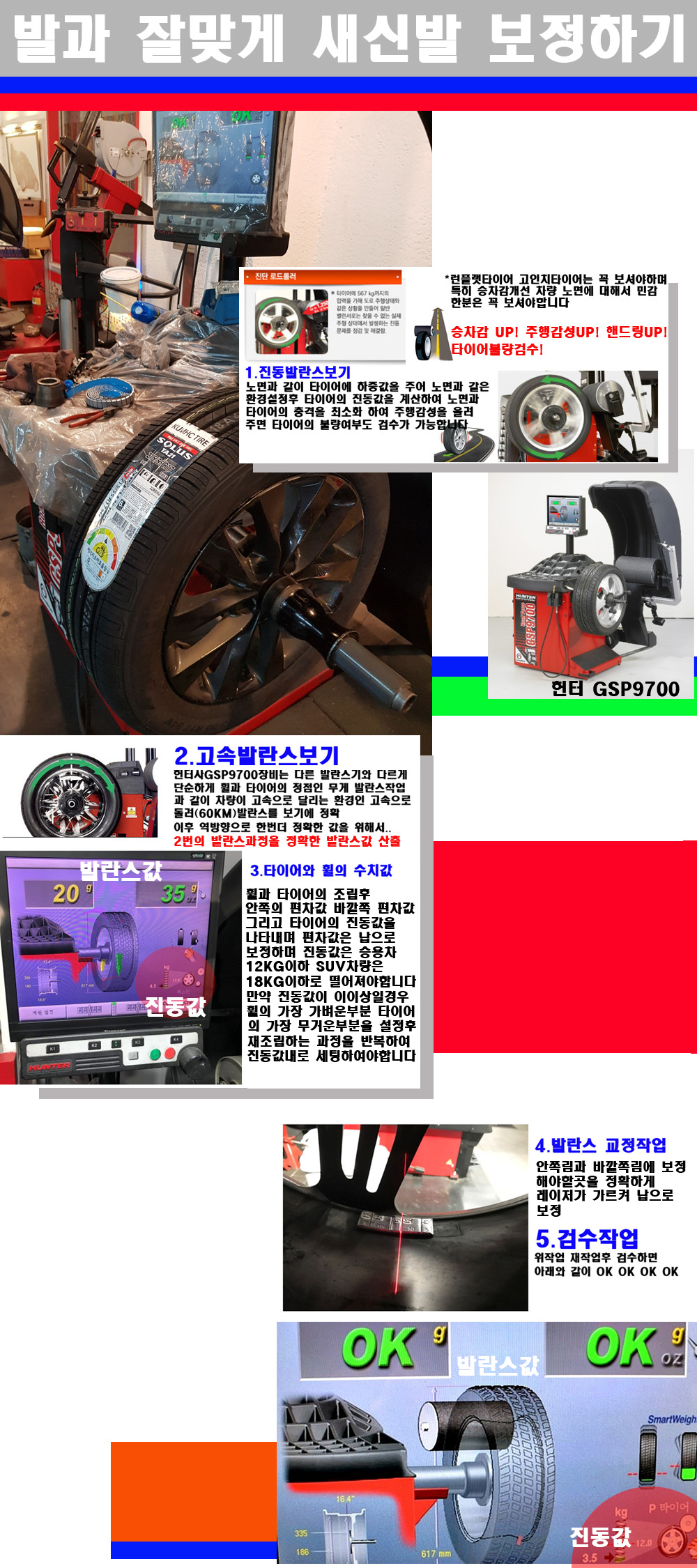 그리고 작업자에게는 불필요한 발란스납을 붙이지 않아 미관상으로 좋고 납을 절약하는 고객님에게도윈이고 작업자에게도 윈윈할수 있는 장비입니다 그리고 시중에서 고속진동발란스라고 말하시는 샵들이 많은데 꼭아셔야하는것은 고속발란스는 말그대로 발란스를 볼때 고속으로 돌리기에 60키로 전후 그리고 진동값을 계산하기위해서는 발란스기에 진동롤러가 있어야합니다 그래서 미국헌터사 GSP9700장비가 유일합니다 다른 샵에서 말하는 발란스기는 고속진동발란스기능없는 일반발란스 기기입니다 이점 꼭 아시고 장착하시기를 바랍니다