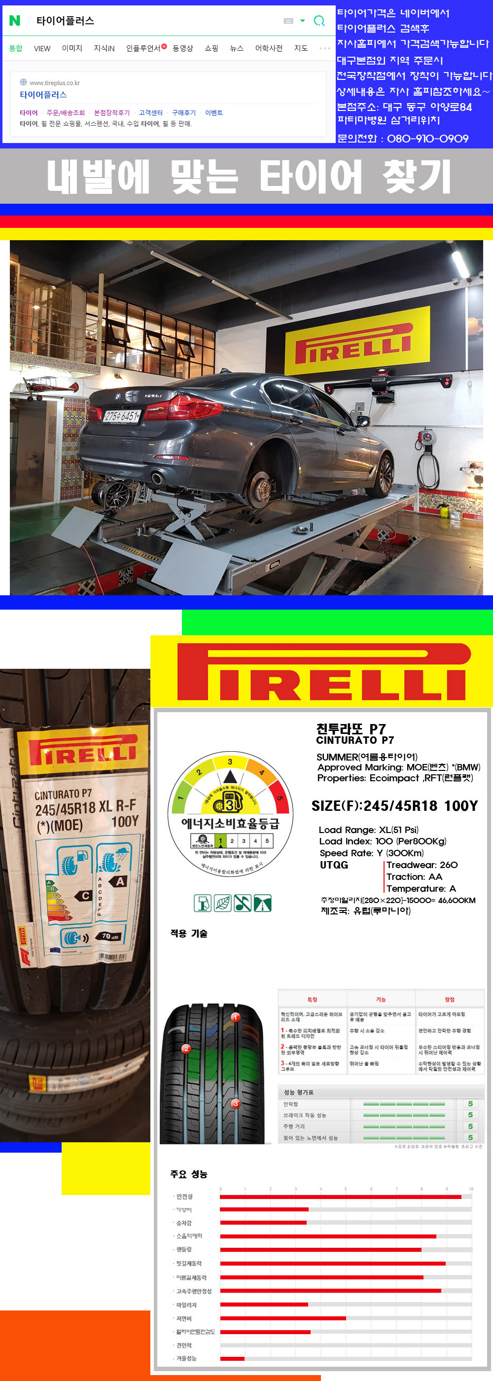 물론 한국 금호 넥센 브리지스톤 미쉐린 콘티넨탈 피렐리 던롭 굳이어 요코하마 등 세계유수의 10대 브랜드타이어만 취급하고 있습니다 타이어매장중 단일규모로는 아마 전국에서 제일 커지않을까 생각합니다 가격도 인터넷 최저가로 장착해 드리고 있습니다 고객님들이 오시면서 너무 고급스러워 가격도 비싸지 않을까 생각하시는데 네이버에서 타이어플러스사이트를 검색해보시면 가격 또한 정말 싸게 판매하고 있구나 하고 생각하실것입니다 물론 장비도 현존하는 장비중 가장 최신장비와 그리고 유럽풍 인테리어의 최고급매장입니다 무엇하나 정품만 취급하며 작업또한 꼼꼼하게 매뉴얼에 따라서 작업을 해드립니다 특히 사장님의 이력이 화려한데 자동차경주 레이스와 미캐닉 국제자격증(A)소지자로서 경험한 풍부한 자동차의 지식을 갖춘분이십니다 특히 자동차잡지사에 타이어에 관한 내용도 기재하신 분이며 타이어회사의 타이어테스트드라이브로도 참여한 분이십니다 제품의 품질이나 제품의 성능등을 장사수단으로 말하지 않고 있는 그대로 말해드리며 특히 사장님 성격상 거짓말을 못하는 성격이여서 믿고 맡겨주시면 후회하지 않을 것입니다 그래서 사장님께서 직접상담해주시고 장착도 해주시는 매장이기에 더 신뢰가 가지 않을까 생각합니다 자사는 인터넷 최저가 기반으로 성장한 회사이기에 가격또한 인터넷 최저가로 장착해 드리고 있습니다 그리고 자사는 고객만족도에서 대상까지 수상한 회사입니다 그래서 한번 저의 매장에서 작업하신 고객님은 아마 다른곳에서는 아마 눈에 차지 않을것이라 생각합니다 가격이면 가격 작업의 완성도면 완성도 그리고 사후 관리까지 최고중에 최고가 되기위해서 노력하는 매장입니다 지금까지 어느 매장에서도 느끼지 못한 감성들을 느끼시기를 바랍니다 감사합니다