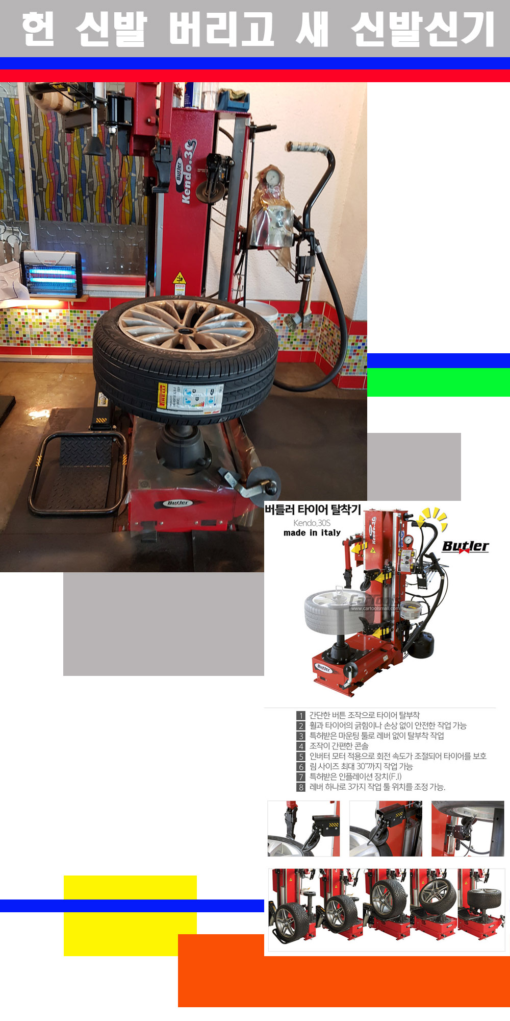 이태리 버틀러사의 켄도3.0S는 휠과 타이어와 조립과 분리시 전혀 제품에 손상을 주지않는 탈착기로 특히 센터락방식(중앙에서 휠를 고정하는 방식)이여서 휠의 중앙부위 잡아서 타이어를 탈부착하고 이후 상하롤러로 타이어를 탈부착합니다 특히 유니포미티작업(휠의 가장가벼운부분과 타이어의 가장 무거운부분을 매칭시키는 작업)시 작업자가 타이어를 정확한 지점에 휠과 매칭시킬수 있는 장점도 있습니다