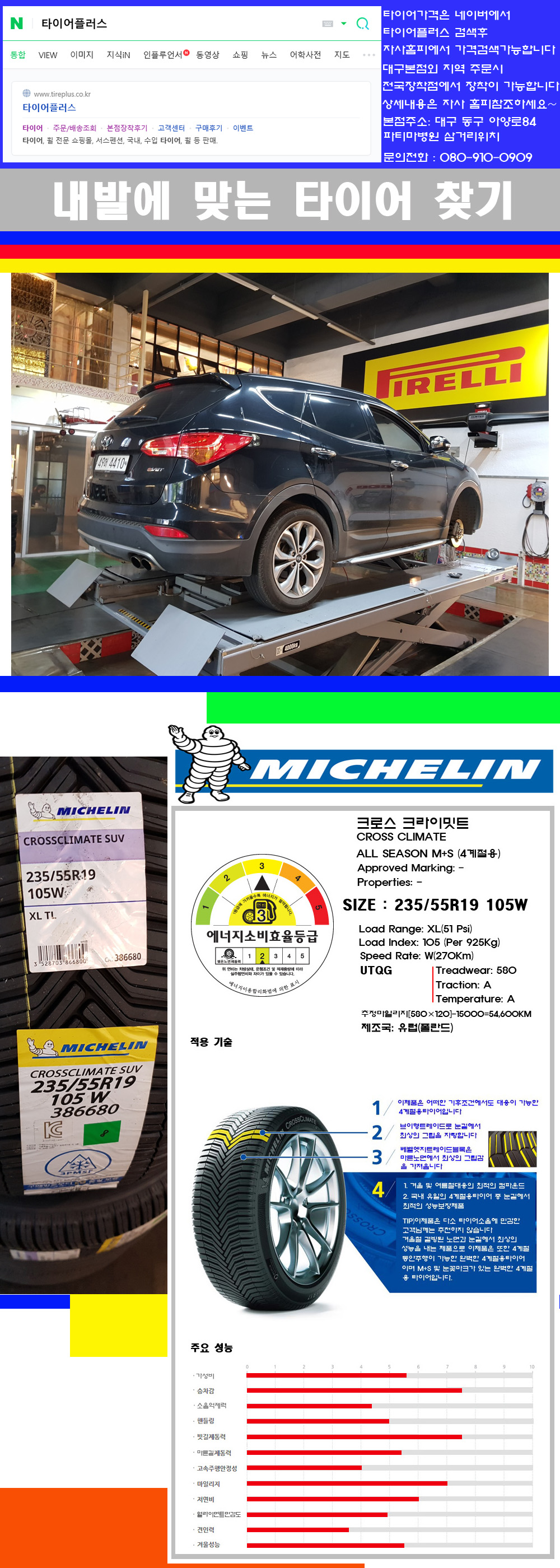 물론 한국 금호 넥센 브리지스톤 미쉐린 콘티넨탈 피렐리 던롭 굳이어 요코하마 등 세계유수의 10대 브랜드타이어만 취급하고 있습니다 타이어매장중 단일규모로는 아마 전국에서 제일 커지않을까 생각합니다 가격도 인터넷 최저가로 장착해 드리고 있습니다 고객님들이 오시면서 너무 고급스러워 가격도 비싸지 않을까 생각하시는데 네이버에서 타이어플러스사이트를 검색해보시면 가격 또한 정말 싸게 판매하고 있구나 하고 생각하실것입니다 물론 장비도 현존하는 장비중 가장 최신장비와 그리고 유럽풍 인테리어의 최고급매장입니다 무엇하나 정품만 취급하며 작업또한 꼼꼼하게 매뉴얼에 따라서 작업을 해드립니다 특히 사장님의 이력이 화려한데 자동차경주 레이스와 미캐닉 국제자격증(A)소지자로서 경험한 풍부한 자동차의 지식을 갖춘분이십니다 특히 자동차잡지사에 타이어에 관한 내용도 기재하신 분이며 타이어회사의 타이어테스트드라이브로도 참여한 분이십니다 제품의 품질이나 제품의 성능등을 장사수단으로 말하지 않고 있는 그대로 말해드리며 특히 사장님 성격상 거짓말을 못하는 성격이여서 믿고 맡겨주시면 후회하지 않을 것입니다 그래서 사장님께서 직접상담해주시고 장착도 해주시는 매장이기에 더 신뢰가 가지 않을까 생각합니다 자사는 인터넷 최저가 기반으로 성장한 회사이기에 가격또한 인터넷 최저가로 장착해 드리고 있습니다 그리고 자사는 고객만족도에서 대상까지 수상한 회사입니다 그래서 한번 저의 매장에서 작업하신 고객님은 아마 다른곳에서는 아마 눈에 차지 않을것이라 생각합니다 가격이면 가격 작업의 완성도면 완성도 그리고 사후 관리까지 최고중에 최고가 되기위해서 노력하는 매장입니다 지금까지 어느 매장에서도 느끼지 못한 감성들을 느끼시기를 바랍니다 감사합니다