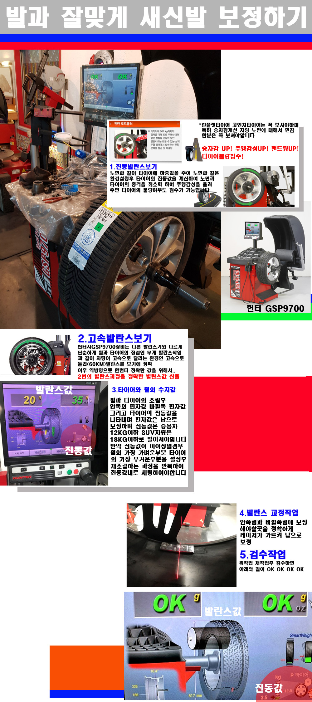 그리고 작업자에게는 불필요한 발란스납을 붙이지 않아 미관상으로 좋고 납을 절약하는 고객님에게도윈이고 작업자에게도 윈윈할수 있는 장비입니다 그리고 시중에서 고속진동발란스라고 말하시는 샵들이 많은데 꼭아셔야하는것은 고속발란스는 말그대로 발란스를 볼때 고속으로 돌리기에 60키로 전후 그리고 진동값을 계산하기위해서는 발란스기에 진동롤러가 있어야합니다 그래서 미국헌터사 GSP9700장비가 유일합니다 다른 샵에서 말하는 발란스기는 고속진동발란스기능없는 일반발란스 기기입니다 이점 꼭 아시고 장착하시기를 바랍니다