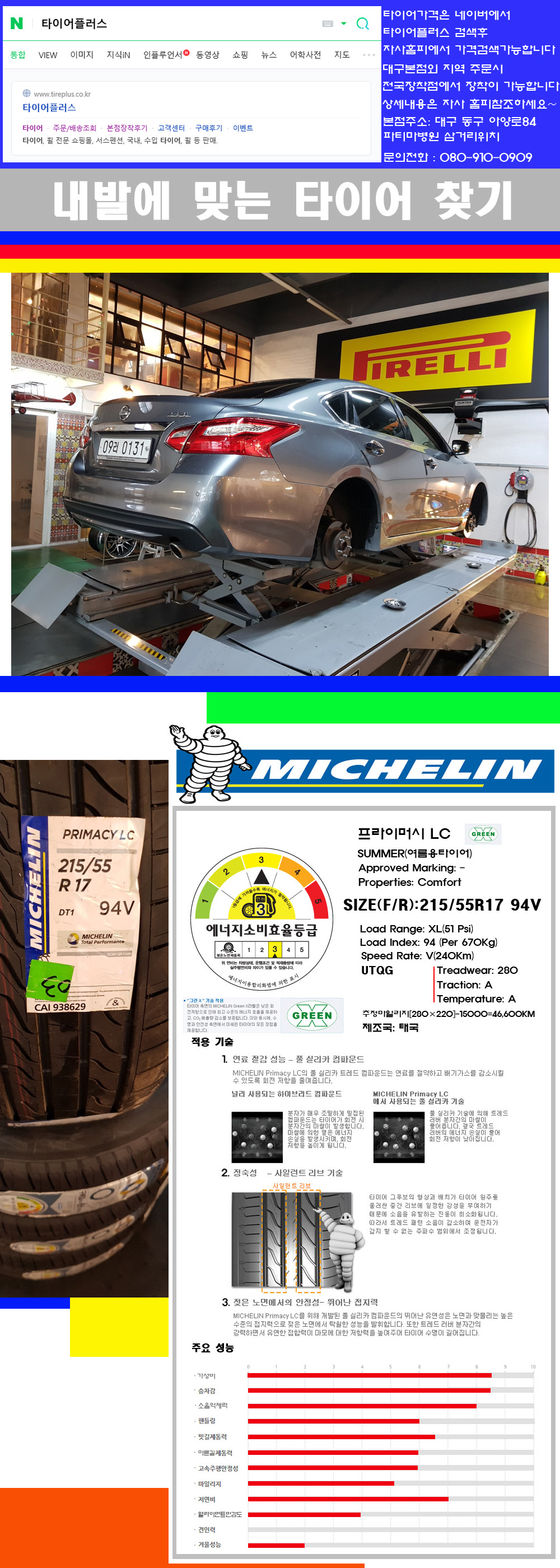 물론 한국 금호 넥센 브리지스톤 미쉐린 콘티넨탈 피렐리 던롭 굳이어 요코하마 등 세계유수의 10대 브랜드타이어만 취급하고 있습니다 타이어매장중 단일규모로는 아마 전국에서 제일 커지않을까 생각합니다 가격도 인터넷 최저가로 장착해 드리고 있습니다 고객님들이 오시면서 너무 고급스러워 가격도 비싸지 않을까 생각하시는데 네이버에서 타이어플러스사이트를 검색해보시면 가격 또한 정말 싸게 판매하고 있구나 하고 생각하실것입니다 물론 장비도 현존하는 장비중 가장 최신장비와 그리고 유럽풍 인테리어의 최고급매장입니다 무엇하나 정품만 취급하며 작업또한 꼼꼼하게 매뉴얼에 따라서 작업을 해드립니다 특히 사장님의 이력이 화려한데 자동차경주 레이스와 미캐닉 국제자격증(A)소지자로서 경험한 풍부한 자동차의 지식을 갖춘분이십니다 특히 자동차잡지사에 타이어에 관한 내용도 기재하신 분이며 타이어회사의 타이어테스트드라이브로도 참여한 분이십니다 제품의 품질이나 제품의 성능등을 장사수단으로 말하지 않고 있는 그대로 말해드리며 특히 사장님 성격상 거짓말을 못하는 성격이여서 믿고 맡겨주시면 후회하지 않을 것입니다 그래서 사장님께서 직접상담해주시고 장착도 해주시는 매장이기에 더 신뢰가 가지 않을까 생각합니다 자사는 인터넷 최저가 기반으로 성장한 회사이기에 가격또한 인터넷 최저가로 장착해 드리고 있습니다 그리고 자사는 고객만족도에서 대상까지 수상한 회사입니다 그래서 한번 저의 매장에서 작업하신 고객님은 아마 다른곳에서는 아마 눈에 차지 않을것이라 생각합니다 가격이면 가격 작업의 완성도면 완성도 그리고 사후 관리까지 최고중에 최고가 되기위해서 노력하는 매장입니다 지금까지 어느 매장에서도 느끼지 못한 감성들을 느끼시기를 바랍니다 감사합니다