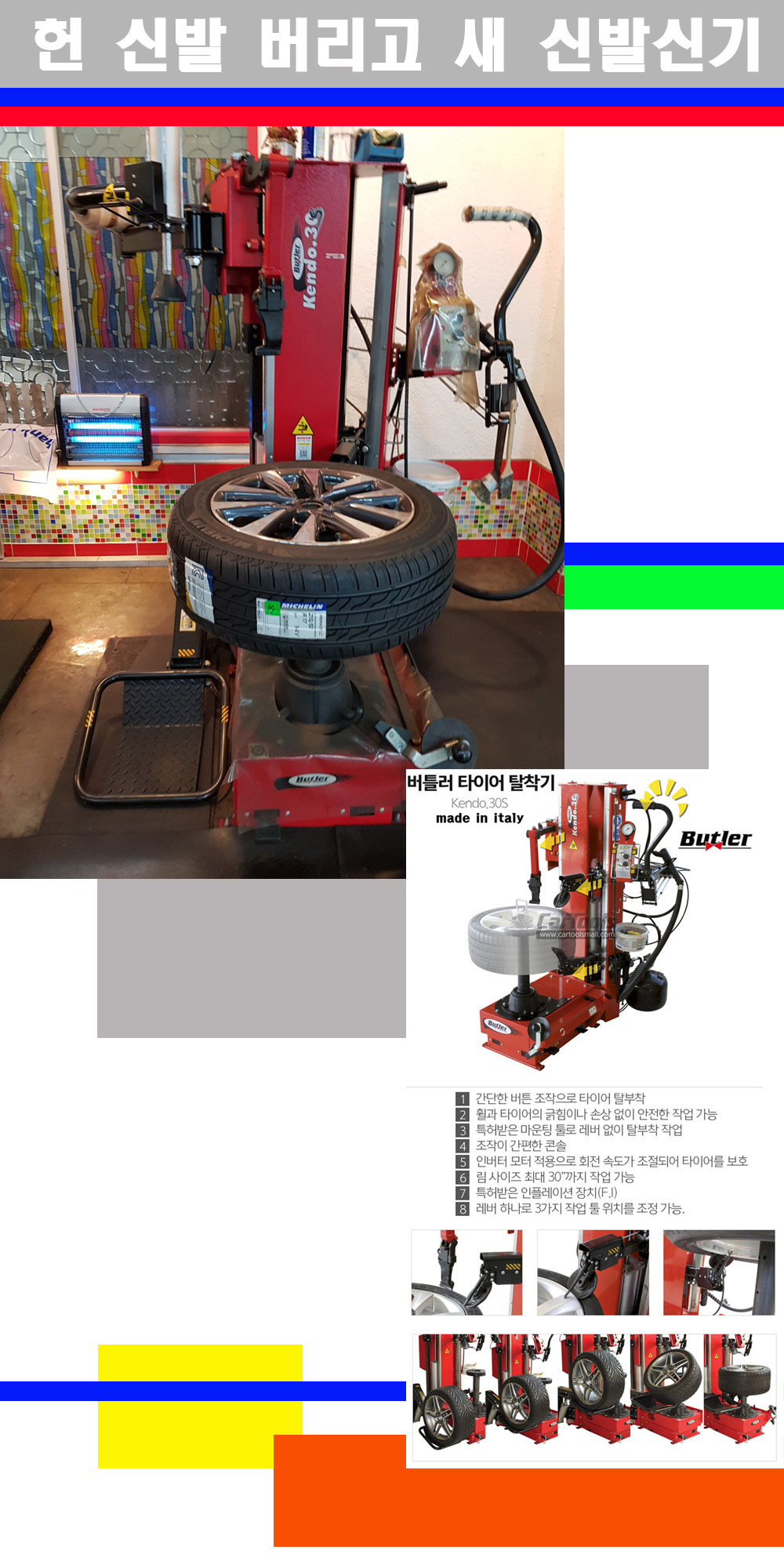 이태리 버틀러사의 켄도3.0S는 휠과 타이어와 조립과 분리시 전혀 제품에 손상을 주지않는 탈착기로 특히 센터락방식(중앙에서 휠를 고정하는 방식)이여서 휠의 중앙부위 잡아서 타이어를 탈부착하고 이후 상하롤러로 타이어를 탈부착합니다 특히 유니포미티작업(휠의 가장가벼운부분과 타이어의 가장 무거운부분을 매칭시키는 작업)시 작업자가 타이어를 정확한 지점에 휠과 매칭시킬수 있는 장점도 있습니다