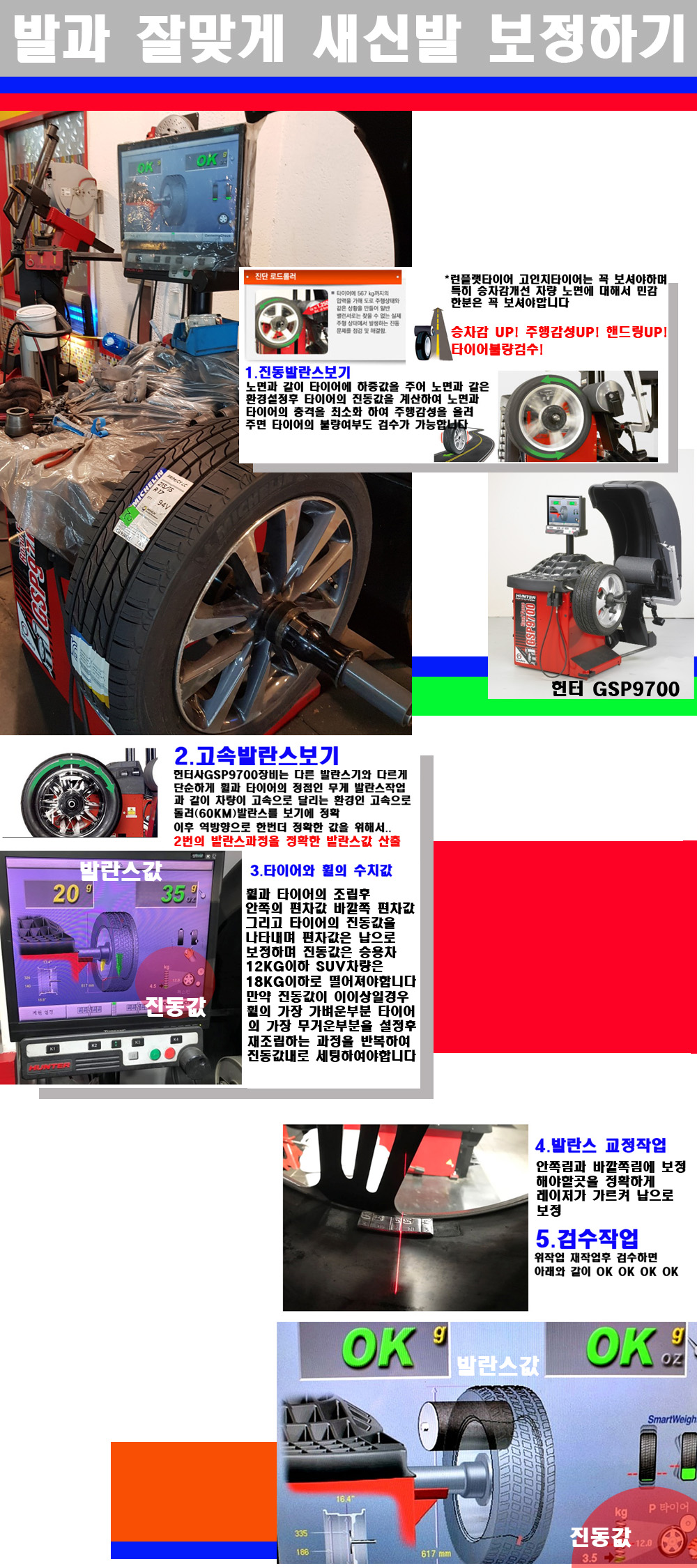 그리고 작업자에게는 불필요한 발란스납을 붙이지 않아 미관상으로 좋고 납을 절약하는 고객님에게도윈이고 작업자에게도 윈윈할수 있는 장비입니다 그리고 시중에서 고속진동발란스라고 말하시는 샵들이 많은데 꼭아셔야하는것은 고속발란스는 말그대로 발란스를 볼때 고속으로 돌리기에 60키로 전후 그리고 진동값을 계산하기위해서는 발란스기에 진동롤러가 있어야합니다 그래서 미국헌터사 GSP9700장비가 유일합니다 다른 샵에서 말하는 발란스기는 고속진동발란스기능없는 일반발란스 기기입니다 이점 꼭 아시고 장착하시기를 바랍니다