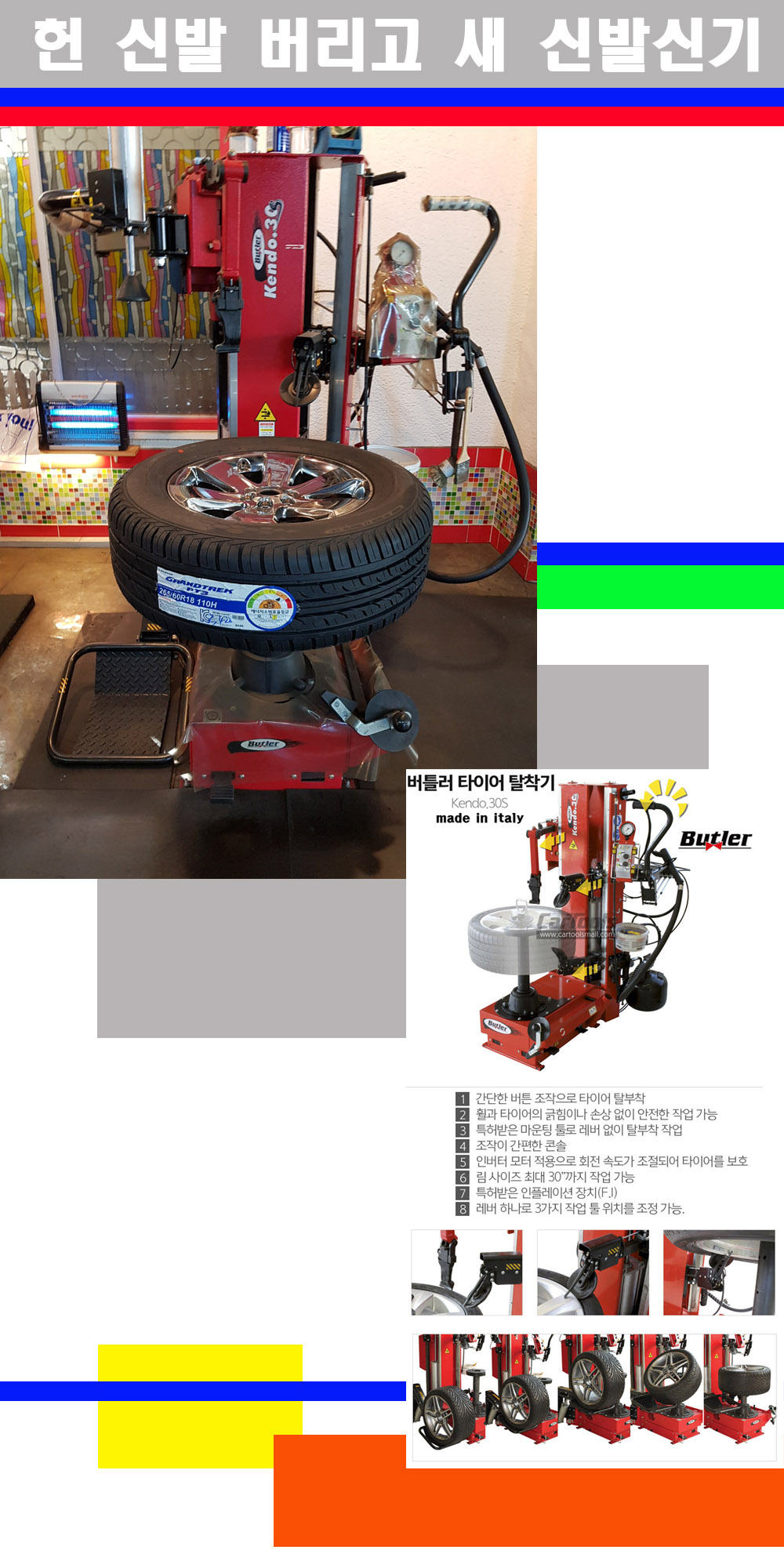 이태리 버틀러사의 켄도3.0S는 휠과 타이어와 조립과 분리시 전혀 제품에 손상을 주지않는 탈착기로 특히 센터락방식(중앙에서 휠를 고정하는 방식)이여서 휠의 중앙부위 잡아서 타이어를 탈부착하고 이후 상하롤러로 타이어를 탈부착합니다 특히 유니포미티작업(휠의 가장가벼운부분과 타이어의 가장 무거운부분을 매칭시키는 작업)시 작업자가 타이어를 정확한 지점에 휠과 매칭시킬수 있는 장점도 있습니다