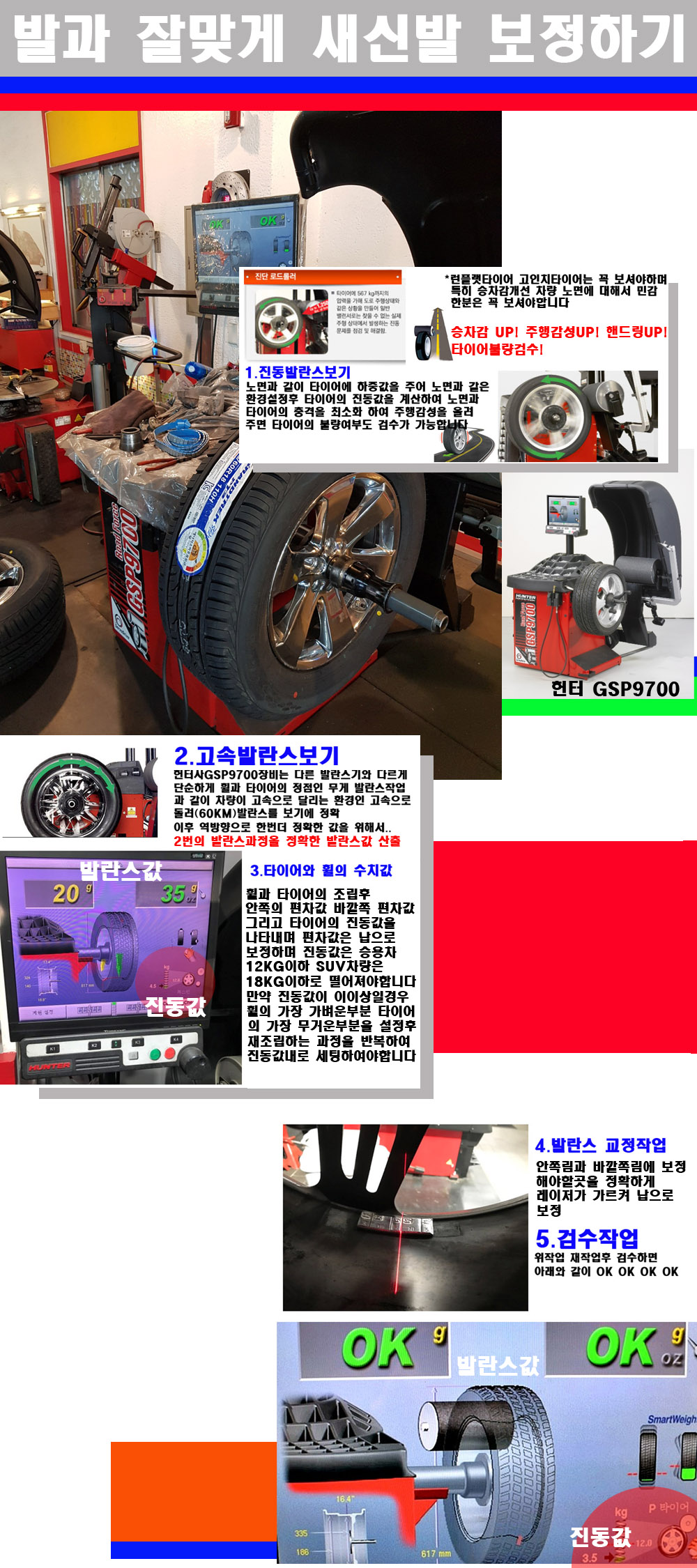 그리고 작업자에게는 불필요한 발란스납을 붙이지 않아 미관상으로 좋고 납을 절약하는 고객님에게도윈이고 작업자에게도 윈윈할수 있는 장비입니다 그리고 시중에서 고속진동발란스라고 말하시는 샵들이 많은데 꼭아셔야하는것은 고속발란스는 말그대로 발란스를 볼때 고속으로 돌리기에 60키로 전후 그리고 진동값을 계산하기위해서는 발란스기에 진동롤러가 있어야합니다 그래서 미국헌터사 GSP9700장비가 유일합니다 다른 샵에서 말하는 발란스기는 고속진동발란스기능없는 일반발란스 기기입니다 이점 꼭 아시고 장착하시기를 바랍니다