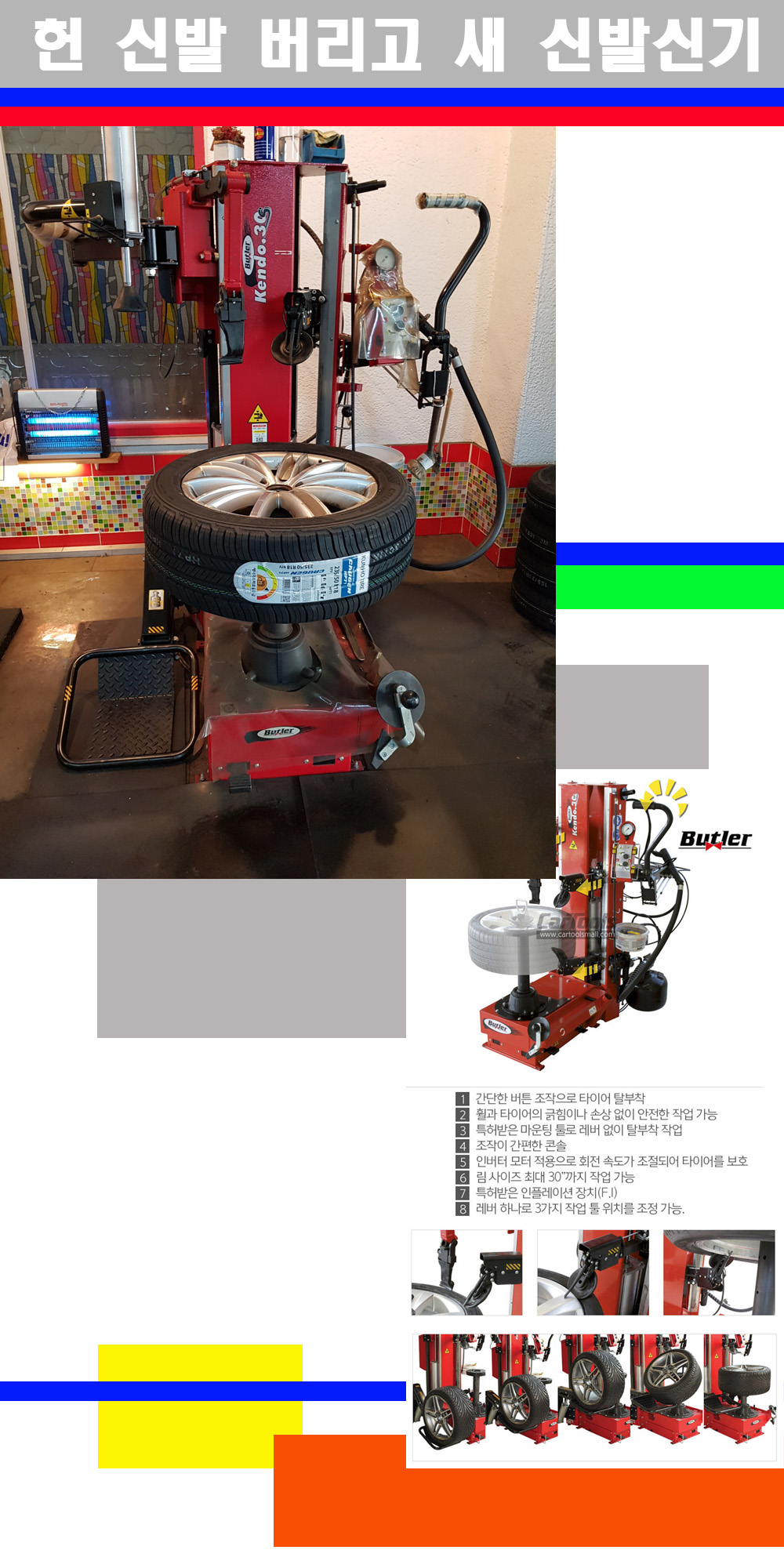 이태리 버틀러사의 켄도3.0S는 휠과 타이어와 조립과 분리시 전혀 제품에 손상을 주지않는 탈착기로 특히 센터락방식(중앙에서 휠를 고정하는 방식)이여서 휠의 중앙부위 잡아서 타이어를 탈부착하고 이후 상하롤러로 타이어를 탈부착합니다 특히 유니포미티작업(휠의 가장가벼운부분과 타이어의 가장 무거운부분을 매칭시키는 작업)시 작업자가 타이어를 정확한 지점에 휠과 매칭시킬수 있는 장점도 있습니다