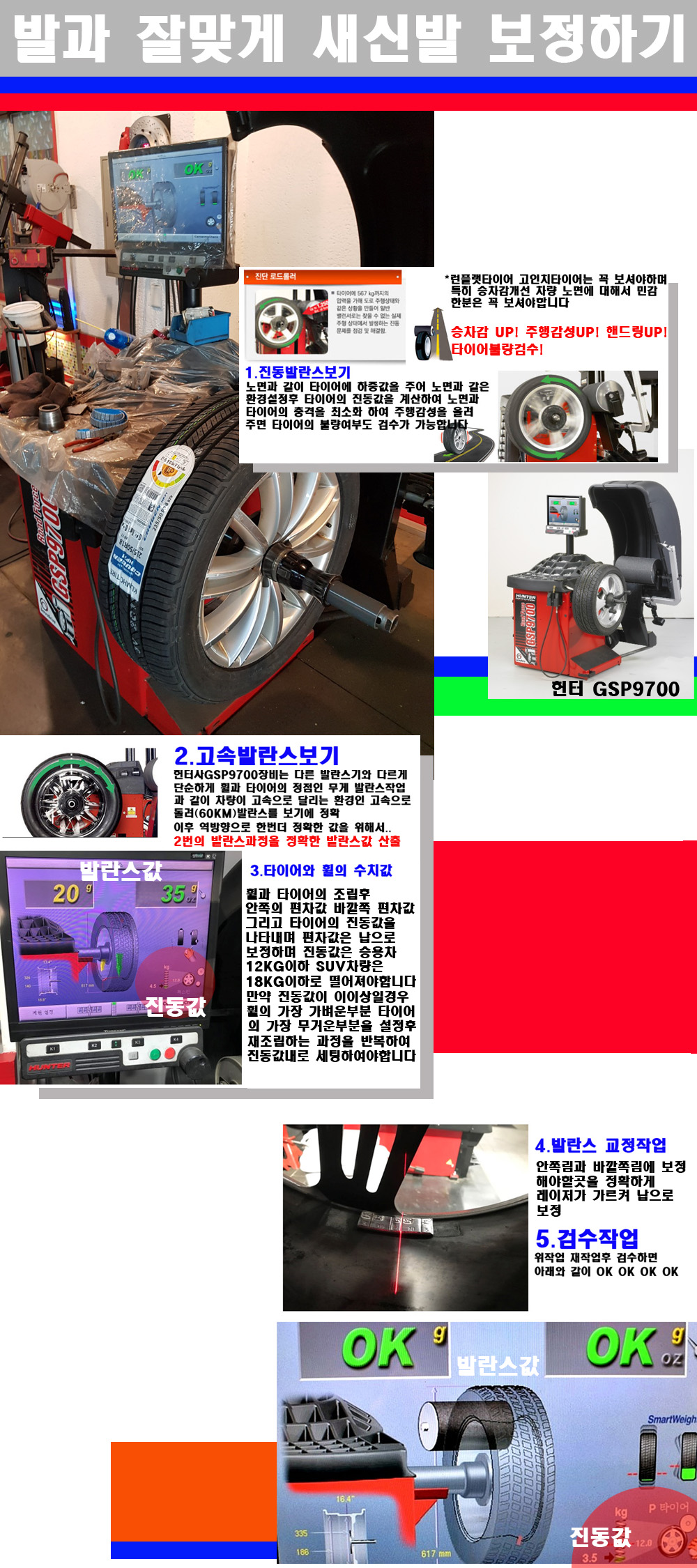 그리고 작업자에게는 불필요한 발란스납을 붙이지 않아 미관상으로 좋고 납을 절약하는 고객님에게도윈이고 작업자에게도 윈윈할수 있는 장비입니다 그리고 시중에서 고속진동발란스라고 말하시는 샵들이 많은데 꼭아셔야하는것은 고속발란스는 말그대로 발란스를 볼때 고속으로 돌리기에 60키로 전후 그리고 진동값을 계산하기위해서는 발란스기에 진동롤러가 있어야합니다 그래서 미국헌터사 GSP9700장비가 유일합니다 다른 샵에서 말하는 발란스기는 고속진동발란스기능없는 일반발란스 기기입니다 이점 꼭 아시고 장착하시기를 바랍니다