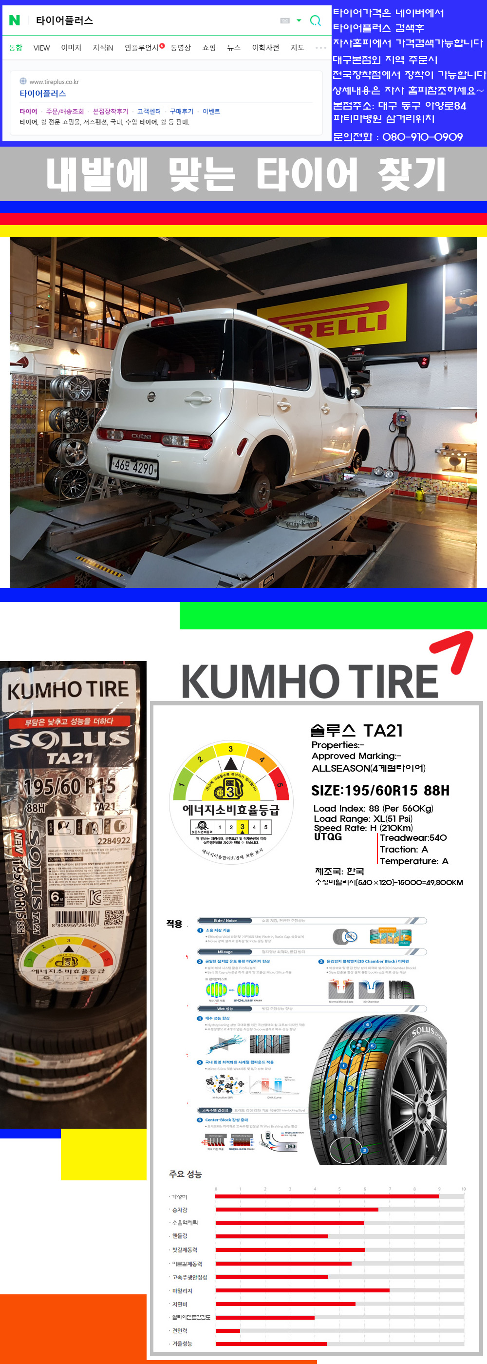 물론 한국 금호 넥센 브리지스톤 미쉐린 콘티넨탈 피렐리 던롭 굳이어 요코하마 등 세계유수의 10대 브랜드타이어만 취급하고 있습니다 타이어매장중 단일규모로는 아마 전국에서 제일 커지않을까 생각합니다 가격도 인터넷 최저가로 장착해 드리고 있습니다 고객님들이 오시면서 너무 고급스러워 가격도 비싸지 않을까 생각하시는데 네이버에서 타이어플러스사이트를 검색해보시면 가격 또한 정말 싸게 판매하고 있구나 하고 생각하실것입니다 물론 장비도 현존하는 장비중 가장 최신장비와 그리고 유럽풍 인테리어의 최고급매장입니다 무엇하나 정품만 취급하며 작업또한 꼼꼼하게 매뉴얼에 따라서 작업을 해드립니다 특히 사장님의 이력이 화려한데 자동차경주 레이스와 미캐닉 국제자격증(A)소지자로서 경험한 풍부한 자동차의 지식을 갖춘분이십니다 특히 자동차잡지사에 타이어에 관한 내용도 기재하신 분이며 타이어회사의 타이어테스트드라이브로도 참여한 분이십니다 제품의 품질이나 제품의 성능등을 장사수단으로 말하지 않고 있는 그대로 말해드리며 특히 사장님 성격상 거짓말을 못하는 성격이여서 믿고 맡겨주시면 후회하지 않을 것입니다 그래서 사장님께서 직접상담해주시고 장착도 해주시는 매장이기에 더 신뢰가 가지 않을까 생각합니다 자사는 인터넷 최저가 기반으로 성장한 회사이기에 가격또한 인터넷 최저가로 장착해 드리고 있습니다 그리고 자사는 고객만족도에서 대상까지 수상한 회사입니다 그래서 한번 저의 매장에서 작업하신 고객님은 아마 다른곳에서는 아마 눈에 차지 않을것이라 생각합니다 가격이면 가격 작업의 완성도면 완성도 그리고 사후 관리까지 최고중에 최고가 되기위해서 노력하는 매장입니다 지금까지 어느 매장에서도 느끼지 못한 감성들을 느끼시기를 바랍니다 감사합니다