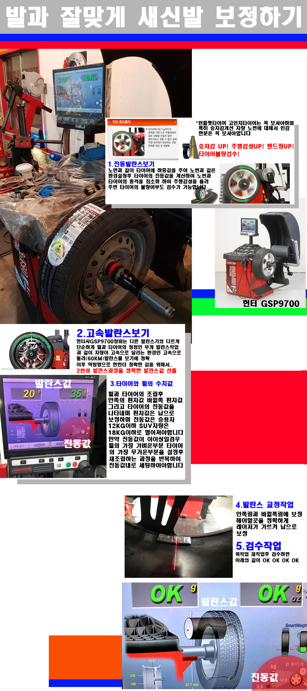 그리고 작업자에게는 불필요한 발란스납을 붙이지 않아 미관상으로 좋고 납을 절약하는 고객님에게도윈이고 작업자에게도 윈윈할수 있는 장비입니다 그리고 시중에서 고속진동발란스라고 말하시는 샵들이 많은데 꼭아셔야하는것은 고속발란스는 말그대로 발란스를 볼때 고속으로 돌리기에 60키로 전후 그리고 진동값을 계산하기위해서는 발란스기에 진동롤러가 있어야합니다 그래서 미국헌터사 GSP9700장비가 유일합니다 다른 샵에서 말하는 발란스기는 고속진동발란스기능없는 일반발란스 기기입니다 이점 꼭 아시고 장착하시기를 바랍니다