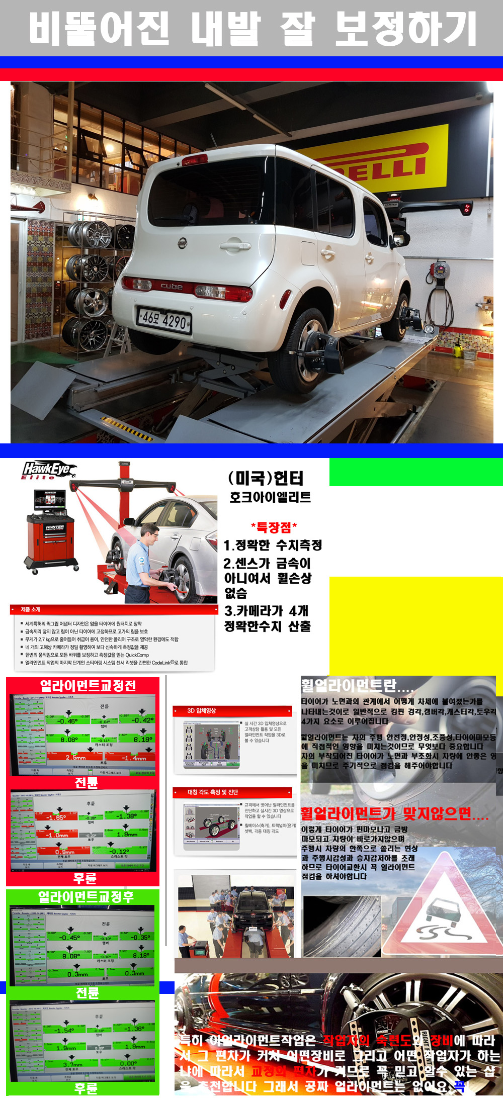 자사는 얼라이먼트정렬시 교정전 교정후를 구분하여 고객님께 직접 이수치값을 확인시켜드리고 작업을 하며 이후 각각의 특성을 가진 타이어들에 대해서 설명 및 관리요령 운전요령 같이 설명해드리고 있습니다