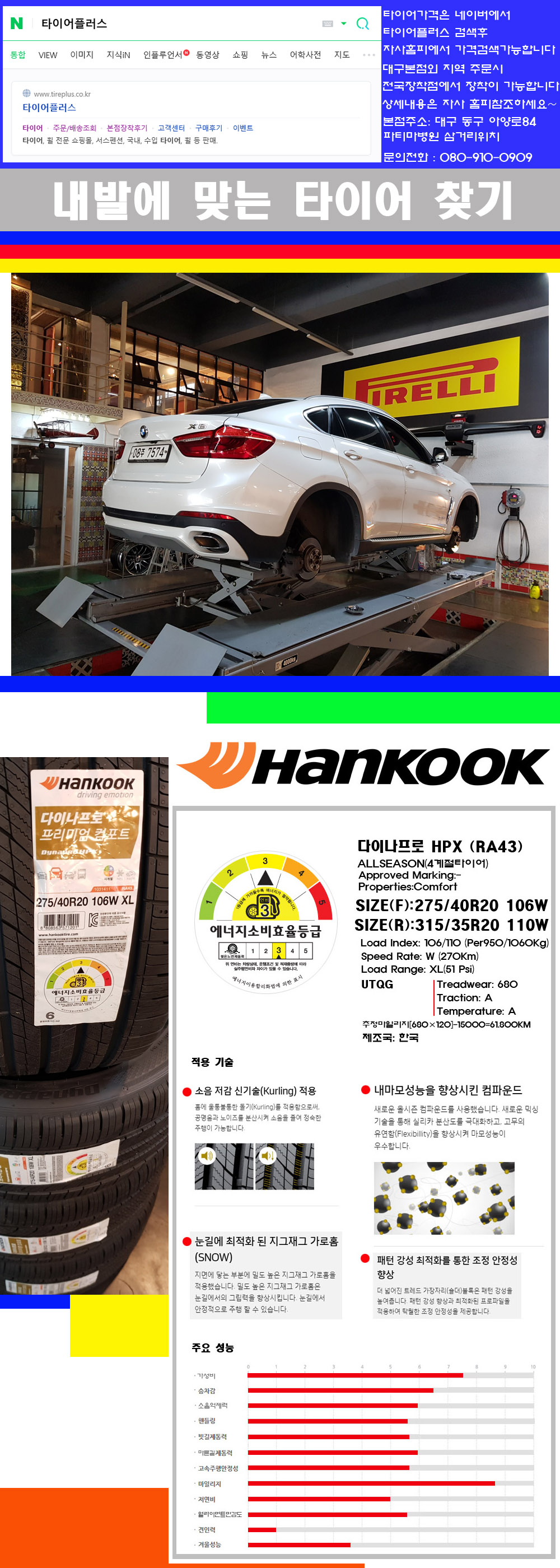 물론 한국 금호 넥센 브리지스톤 미쉐린 콘티넨탈 피렐리 던롭 굳이어 요코하마 등 세계유수의 10대 브랜드타이어만 취급하고 있습니다 타이어매장중 단일규모로는 아마 전국에서 제일 커지않을까 생각합니다 가격도 인터넷 최저가로 장착해 드리고 있습니다 고객님들이 오시면서 너무 고급스러워 가격도 비싸지 않을까 생각하시는데 네이버에서 타이어플러스사이트를 검색해보시면 가격 또한 정말 싸게 판매하고 있구나 하고 생각하실것입니다 물론 장비도 현존하는 장비중 가장 최신장비와 그리고 유럽풍 인테리어의 최고급매장입니다 무엇하나 정품만 취급하며 작업또한 꼼꼼하게 매뉴얼에 따라서 작업을 해드립니다 특히 사장님의 이력이 화려한데 자동차경주 레이스와 미캐닉 국제자격증(A)소지자로서 경험한 풍부한 자동차의 지식을 갖춘분이십니다 특히 자동차잡지사에 타이어에 관한 내용도 기재하신 분이며 타이어회사의 타이어테스트드라이브로도 참여한 분이십니다 제품의 품질이나 제품의 성능등을 장사수단으로 말하지 않고 있는 그대로 말해드리며 특히 사장님 성격상 거짓말을 못하는 성격이여서 믿고 맡겨주시면 후회하지 않을 것입니다 그래서 사장님께서 직접상담해주시고 장착도 해주시는 매장이기에 더 신뢰가 가지 않을까 생각합니다 자사는 인터넷 최저가 기반으로 성장한 회사이기에 가격또한 인터넷 최저가로 장착해 드리고 있습니다 그리고 자사는 고객만족도에서 대상까지 수상한 회사입니다 그래서 한번 저의 매장에서 작업하신 고객님은 아마 다른곳에서는 아마 눈에 차지 않을것이라 생각합니다 가격이면 가격 작업의 완성도면 완성도 그리고 사후 관리까지 최고중에 최고가 되기위해서 노력하는 매장입니다 지금까지 어느 매장에서도 느끼지 못한 감성들을 느끼시기를 바랍니다 감사합니다
