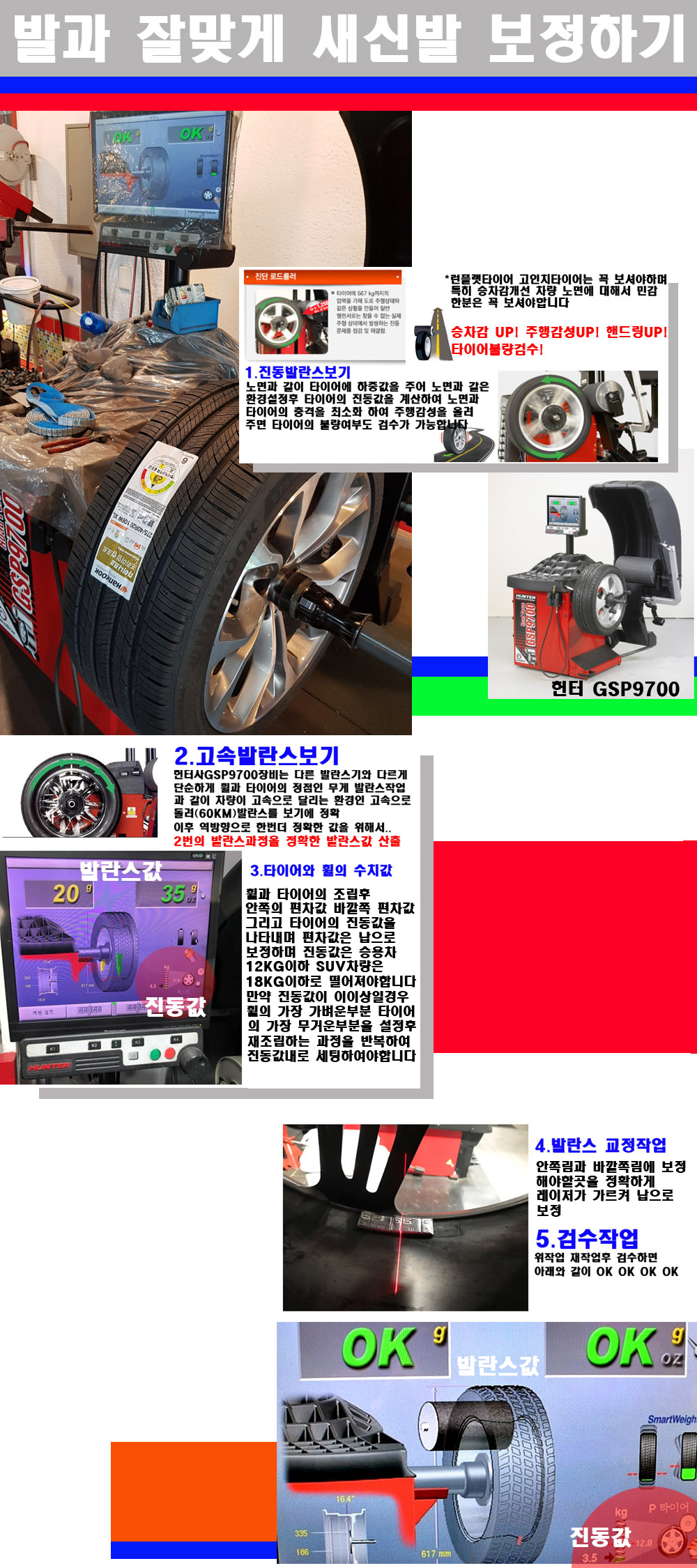 그리고 작업자에게는 불필요한 발란스납을 붙이지 않아 미관상으로 좋고 납을 절약하는 고객님에게도윈이고 작업자에게도 윈윈할수 있는 장비입니다 그리고 시중에서 고속진동발란스라고 말하시는 샵들이 많은데 꼭아셔야하는것은 고속발란스는 말그대로 발란스를 볼때 고속으로 돌리기에 60키로 전후 그리고 진동값을 계산하기위해서는 발란스기에 진동롤러가 있어야합니다 그래서 미국헌터사 GSP9700장비가 유일합니다 다른 샵에서 말하는 발란스기는 고속진동발란스기능없는 일반발란스 기기입니다 이점 꼭 아시고 장착하시기를 바랍니다