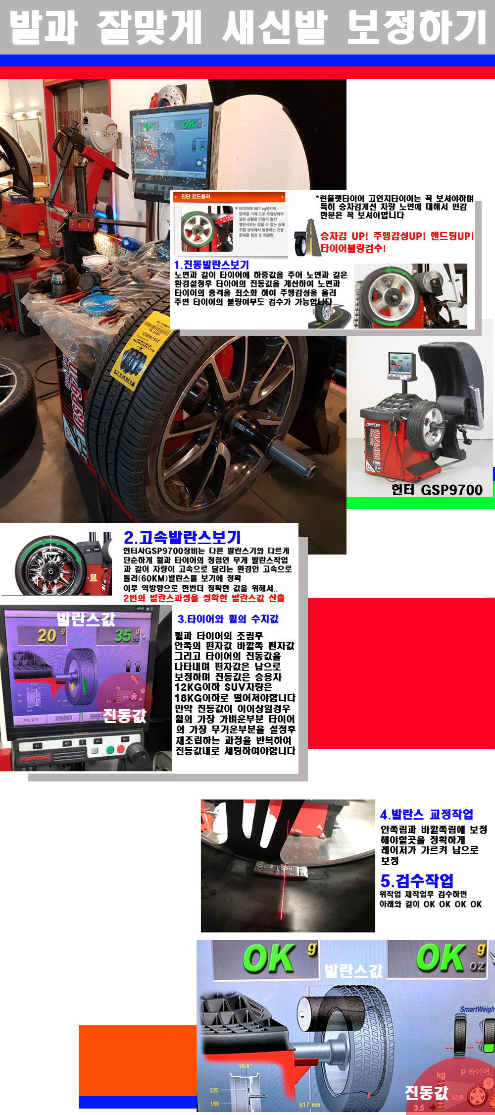 그리고 작업자에게는 불필요한 발란스납을 붙이지 않아 미관상으로 좋고 납을 절약하는 고객님에게도윈이고 작업자에게도 윈윈할수 있는 장비입니다 그리고 시중에서 고속진동발란스라고 말하시는 샵들이 많은데 꼭아셔야하는것은 고속발란스는 말그대로 발란스를 볼때 고속으로 돌리기에 60키로 전후 그리고 진동값을 계산하기위해서는 발란스기에 진동롤러가 있어야합니다 그래서 미국헌터사 GSP9700장비가 유일합니다 다른 샵에서 말하는 발란스기는 고속진동발란스기능없는 일반발란스 기기입니다 이점 꼭 아시고 장착하시기를 바랍니다