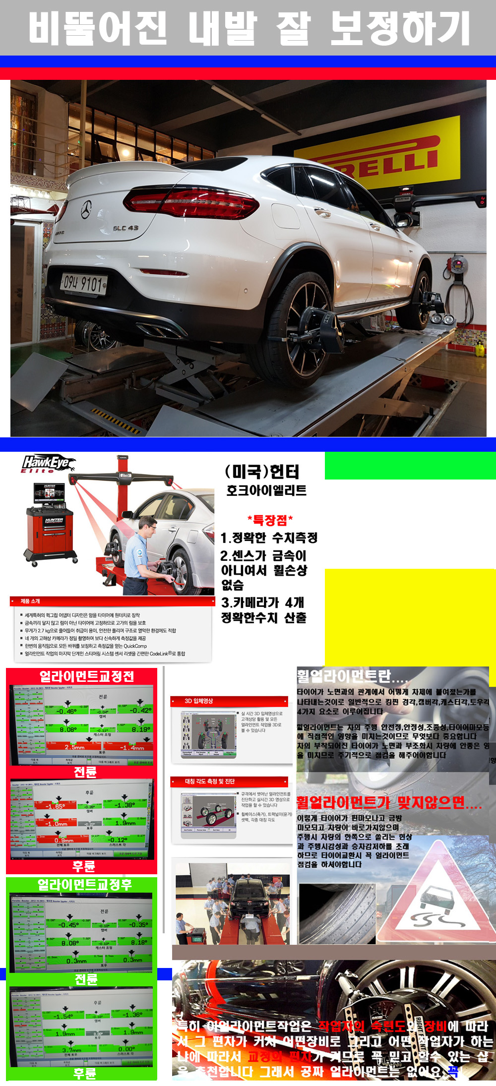 자사는 얼라이먼트정렬시 교정전 교정후를 구분하여 고객님께 직접 이수치값을 확인시켜드리고 작업을 하며 이후 각각의 특성을 가진 타이어들에 대해서 설명 및 관리요령 운전요령 같이 설명해드리고 있습니다