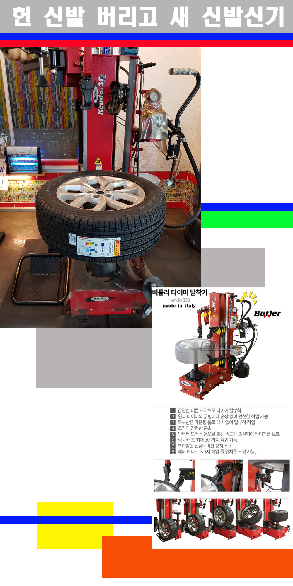 이태리 버틀러사의 켄도3.0S는 휠과 타이어와 조립과 분리시 전혀 제품에 손상을 주지않는 탈착기로 특히 센터락방식(중앙에서 휠를 고정하는 방식)이여서 휠의 중앙부위 잡아서 타이어를 탈부착하고 이후 상하롤러로 타이어를 탈부착합니다 특히 유니포미티작업(휠의 가장가벼운부분과 타이어의 가장 무거운부분을 매칭시키는 작업)시 작업자가 타이어를 정확한 지점에 휠과 매칭시킬수 있는 장점도 있습니다