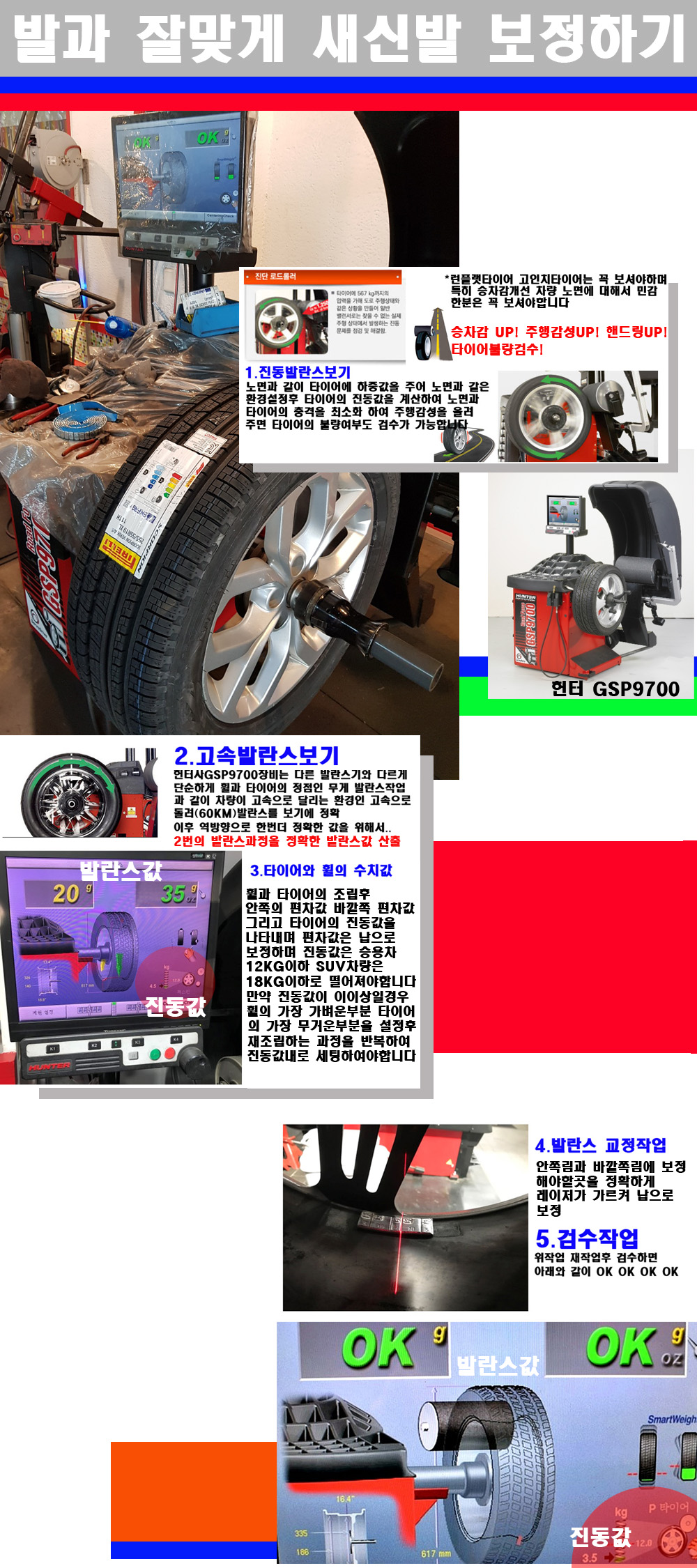 그리고 작업자에게는 불필요한 발란스납을 붙이지 않아 미관상으로 좋고 납을 절약하는 고객님에게도윈이고 작업자에게도 윈윈할수 있는 장비입니다 그리고 시중에서 고속진동발란스라고 말하시는 샵들이 많은데 꼭아셔야하는것은 고속발란스는 말그대로 발란스를 볼때 고속으로 돌리기에 60키로 전후 그리고 진동값을 계산하기위해서는 발란스기에 진동롤러가 있어야합니다 그래서 미국헌터사 GSP9700장비가 유일합니다 다른 샵에서 말하는 발란스기는 고속진동발란스기능없는 일반발란스 기기입니다 이점 꼭 아시고 장착하시기를 바랍니다