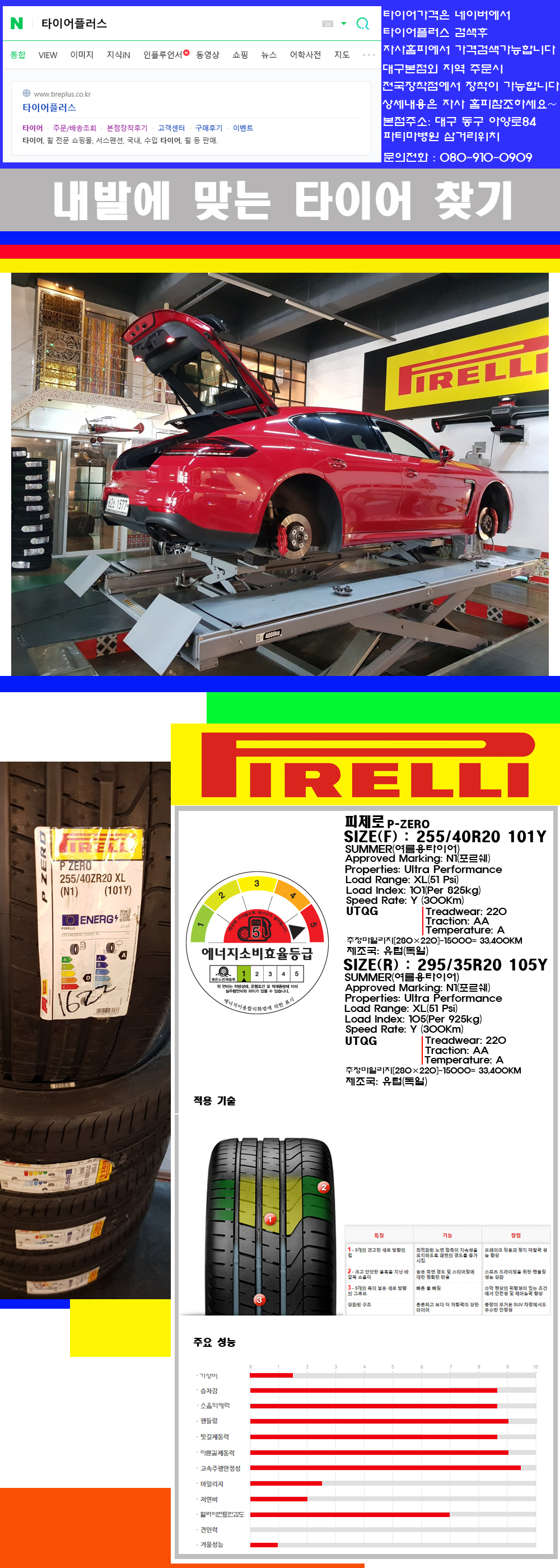 물론 한국 금호 넥센 브리지스톤 미쉐린 콘티넨탈 피렐리 던롭 굳이어 요코하마 등 세계유수의 10대 브랜드타이어만 취급하고 있습니다 타이어매장중 단일규모로는 아마 전국에서 제일 커지않을까 생각합니다 가격도 인터넷 최저가로 장착해 드리고 있습니다 고객님들이 오시면서 너무 고급스러워 가격도 비싸지 않을까 생각하시는데 네이버에서 타이어플러스사이트를 검색해보시면 가격 또한 정말 싸게 판매하고 있구나 하고 생각하실것입니다 물론 장비도 현존하는 장비중 가장 최신장비와 그리고 유럽풍 인테리어의 최고급매장입니다 무엇하나 정품만 취급하며 작업또한 꼼꼼하게 매뉴얼에 따라서 작업을 해드립니다 특히 사장님의 이력이 화려한데 자동차경주 레이스와 미캐닉 국제자격증(A)소지자로서 경험한 풍부한 자동차의 지식을 갖춘분이십니다 특히 자동차잡지사에 타이어에 관한 내용도 기재하신 분이며 타이어회사의 타이어테스트드라이브로도 참여한 분이십니다 제품의 품질이나 제품의 성능등을 장사수단으로 말하지 않고 있는 그대로 말해드리며 특히 사장님 성격상 거짓말을 못하는 성격이여서 믿고 맡겨주시면 후회하지 않을 것입니다 그래서 사장님께서 직접상담해주시고 장착도 해주시는 매장이기에 더 신뢰가 가지 않을까 생각합니다 자사는 인터넷 최저가 기반으로 성장한 회사이기에 가격또한 인터넷 최저가로 장착해 드리고 있습니다 그리고 자사는 고객만족도에서 대상까지 수상한 회사입니다 그래서 한번 저의 매장에서 작업하신 고객님은 아마 다른곳에서는 아마 눈에 차지 않을것이라 생각합니다 가격이면 가격 작업의 완성도면 완성도 그리고 사후 관리까지 최고중에 최고가 되기위해서 노력하는 매장입니다 지금까지 어느 매장에서도 느끼지 못한 감성들을 느끼시기를 바랍니다 감사합니다