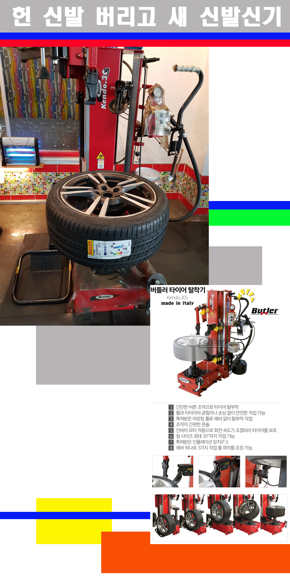 이태리 버틀러사의 켄도3.0S는 휠과 타이어와 조립과 분리시 전혀 제품에 손상을 주지않는 탈착기로 특히 센터락방식(중앙에서 휠를 고정하는 방식)이여서 휠의 중앙부위 잡아서 타이어를 탈부착하고 이후 상하롤러로 타이어를 탈부착합니다 특히 유니포미티작업(휠의 가장가벼운부분과 타이어의 가장 무거운부분을 매칭시키는 작업)시 작업자가 타이어를 정확한 지점에 휠과 매칭시킬수 있는 장점도 있습니다