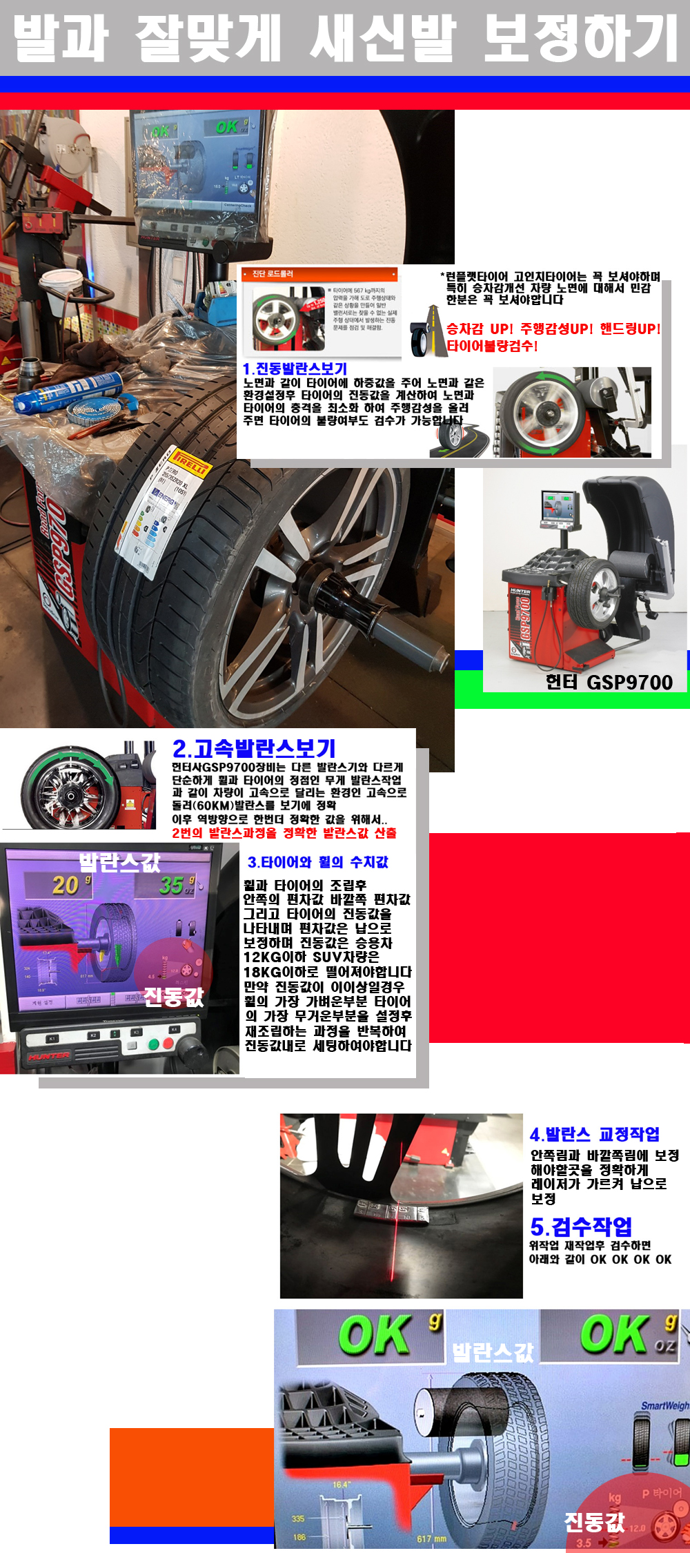 그리고 작업자에게는 불필요한 발란스납을 붙이지 않아 미관상으로 좋고 납을 절약하는 고객님에게도윈이고 작업자에게도 윈윈할수 있는 장비입니다 그리고 시중에서 고속진동발란스라고 말하시는 샵들이 많은데 꼭아셔야하는것은 고속발란스는 말그대로 발란스를 볼때 고속으로 돌리기에 60키로 전후 그리고 진동값을 계산하기위해서는 발란스기에 진동롤러가 있어야합니다 그래서 미국헌터사 GSP9700장비가 유일합니다 다른 샵에서 말하는 발란스기는 고속진동발란스기능없는 일반발란스 기기입니다 이점 꼭 아시고 장착하시기를 바랍니다