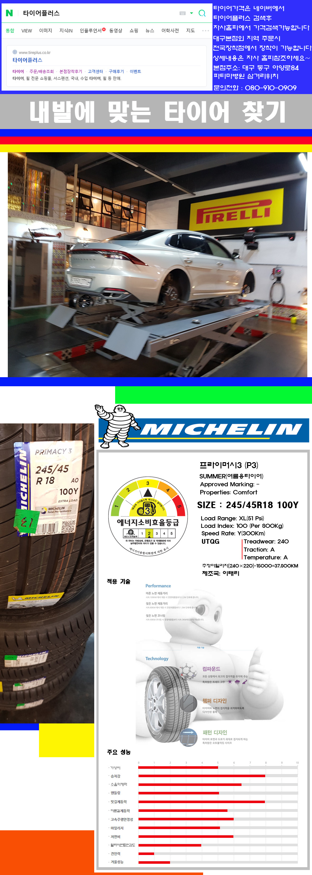 물론 한국 금호 넥센 브리지스톤 미쉐린 콘티넨탈 피렐리 던롭 굳이어 요코하마 등 세계유수의 10대 브랜드타이어만 취급하고 있습니다 타이어매장중 단일규모로는 아마 전국에서 제일 커지않을까 생각합니다 가격도 인터넷 최저가로 장착해 드리고 있습니다 고객님들이 오시면서 너무 고급스러워 가격도 비싸지 않을까 생각하시는데 네이버에서 타이어플러스사이트를 검색해보시면 가격 또한 정말 싸게 판매하고 있구나 하고 생각하실것입니다 물론 장비도 현존하는 장비중 가장 최신장비와 그리고 유럽풍 인테리어의 최고급매장입니다 무엇하나 정품만 취급하며 작업또한 꼼꼼하게 매뉴얼에 따라서 작업을 해드립니다 특히 사장님의 이력이 화려한데 자동차경주 레이스와 미캐닉 국제자격증(A)소지자로서 경험한 풍부한 자동차의 지식을 갖춘분이십니다 특히 자동차잡지사에 타이어에 관한 내용도 기재하신 분이며 타이어회사의 타이어테스트드라이브로도 참여한 분이십니다 제품의 품질이나 제품의 성능등을 장사수단으로 말하지 않고 있는 그대로 말해드리며 특히 사장님 성격상 거짓말을 못하는 성격이여서 믿고 맡겨주시면 후회하지 않을 것입니다 그래서 사장님께서 직접상담해주시고 장착도 해주시는 매장이기에 더 신뢰가 가지 않을까 생각합니다 자사는 인터넷 최저가 기반으로 성장한 회사이기에 가격또한 인터넷 최저가로 장착해 드리고 있습니다 그리고 자사는 고객만족도에서 대상까지 수상한 회사입니다 그래서 한번 저의 매장에서 작업하신 고객님은 아마 다른곳에서는 아마 눈에 차지 않을것이라 생각합니다 가격이면 가격 작업의 완성도면 완성도 그리고 사후 관리까지 최고중에 최고가 되기위해서 노력하는 매장입니다 지금까지 어느 매장에서도 느끼지 못한 감성들을 느끼시기를 바랍니다 감사합니다