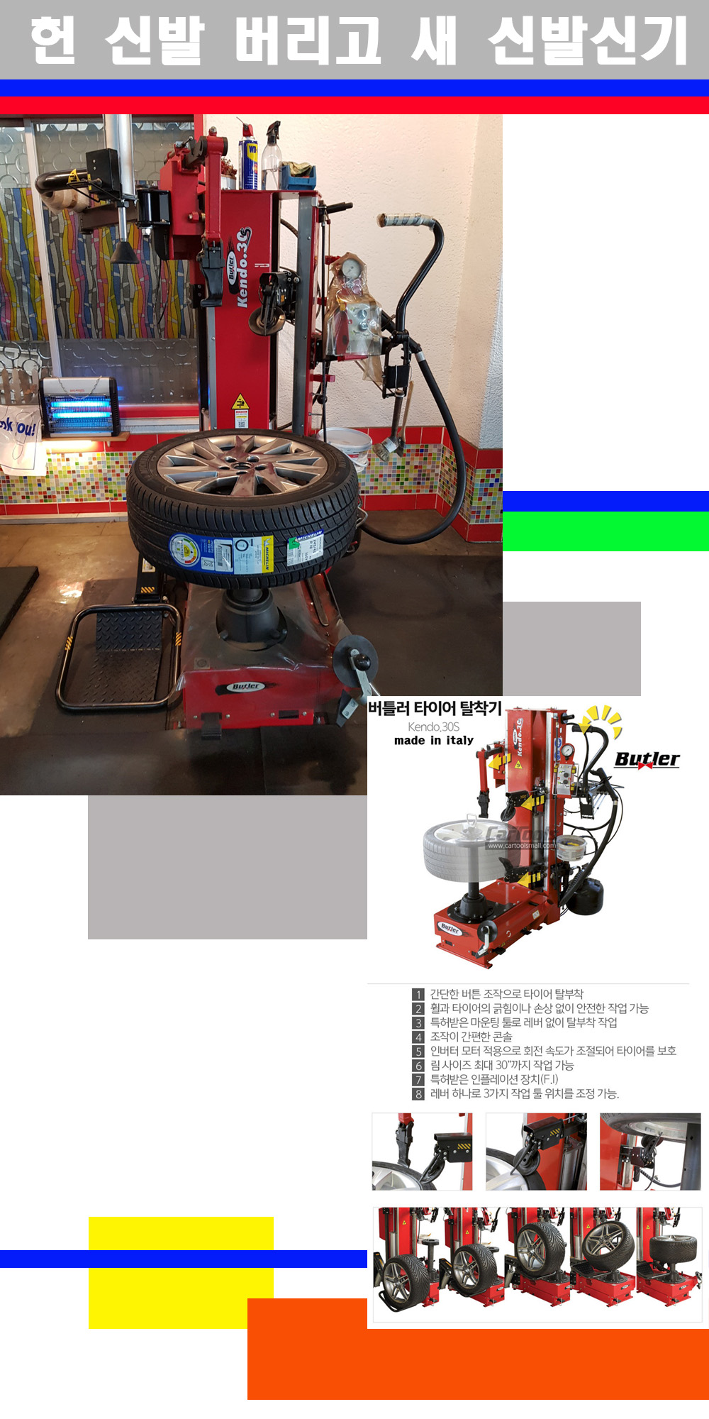 이태리 버틀러사의 켄도3.0S는 휠과 타이어와 조립과 분리시 전혀 제품에 손상을 주지않는 탈착기로 특히 센터락방식(중앙에서 휠를 고정하는 방식)이여서 휠의 중앙부위 잡아서 타이어를 탈부착하고 이후 상하롤러로 타이어를 탈부착합니다 특히 유니포미티작업(휠의 가장가벼운부분과 타이어의 가장 무거운부분을 매칭시키는 작업)시 작업자가 타이어를 정확한 지점에 휠과 매칭시킬수 있는 장점도 있습니다