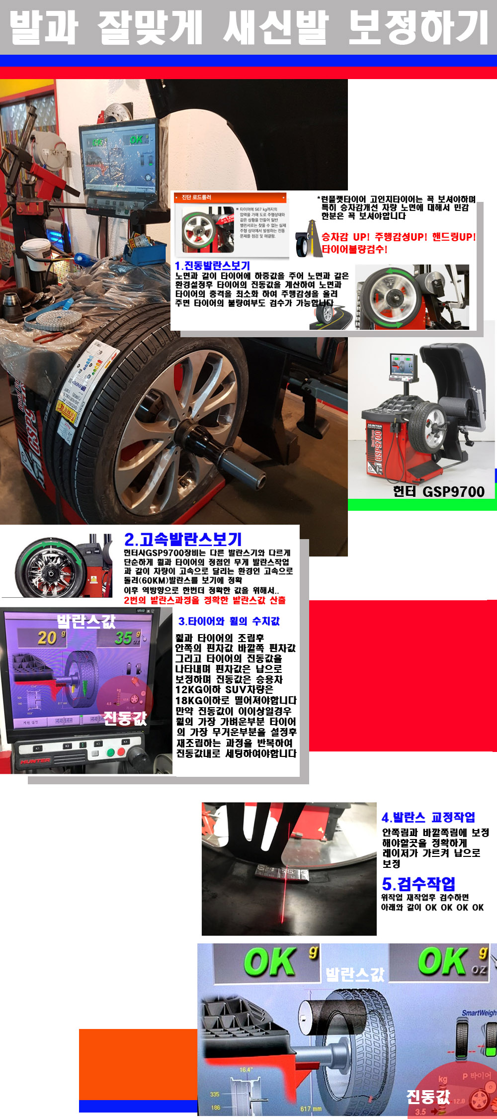 그리고 작업자에게는 불필요한 발란스납을 붙이지 않아 미관상으로 좋고 납을 절약하는 고객님에게도윈이고 작업자에게도 윈윈할수 있는 장비입니다 그리고 시중에서 고속진동발란스라고 말하시는 샵들이 많은데 꼭아셔야하는것은 고속발란스는 말그대로 발란스를 볼때 고속으로 돌리기에 60키로 전후 그리고 진동값을 계산하기위해서는 발란스기에 진동롤러가 있어야합니다 그래서 미국헌터사 GSP9700장비가 유일합니다 다른 샵에서 말하는 발란스기는 고속진동발란스기능없는 일반발란스 기기입니다 이점 꼭 아시고 장착하시기를 바랍니다