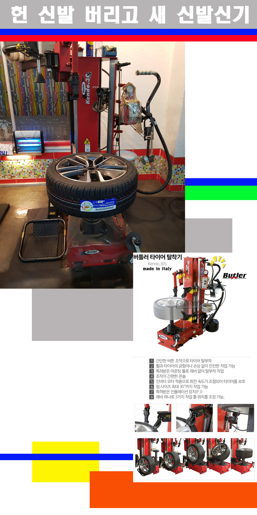 이태리 버틀러사의 켄도3.0S는 휠과 타이어와 조립과 분리시 전혀 제품에 손상을 주지않는 탈착기로 특히 센터락방식(중앙에서 휠를 고정하는 방식)이여서 휠의 중앙부위 잡아서 타이어를 탈부착하고 이후 상하롤러로 타이어를 탈부착합니다 특히 유니포미티작업(휠의 가장가벼운부분과 타이어의 가장 무거운부분을 매칭시키는 작업)시 작업자가 타이어를 정확한 지점에 휠과 매칭시킬수 있는 장점도 있습니다
