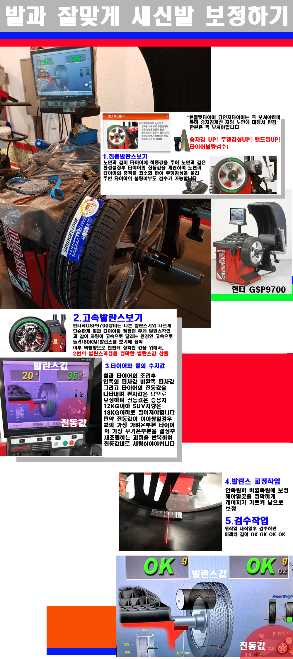 그리고 작업자에게는 불필요한 발란스납을 붙이지 않아 미관상으로 좋고 납을 절약하는 고객님에게도윈이고 작업자에게도 윈윈할수 있는 장비입니다 그리고 시중에서 고속진동발란스라고 말하시는 샵들이 많은데 꼭아셔야하는것은 고속발란스는 말그대로 발란스를 볼때 고속으로 돌리기에 60키로 전후 그리고 진동값을 계산하기위해서는 발란스기에 진동롤러가 있어야합니다 그래서 미국헌터사 GSP9700장비가 유일합니다 다른 샵에서 말하는 발란스기는 고속진동발란스기능없는 일반발란스 기기입니다 이점 꼭 아시고 장착하시기를 바랍니다