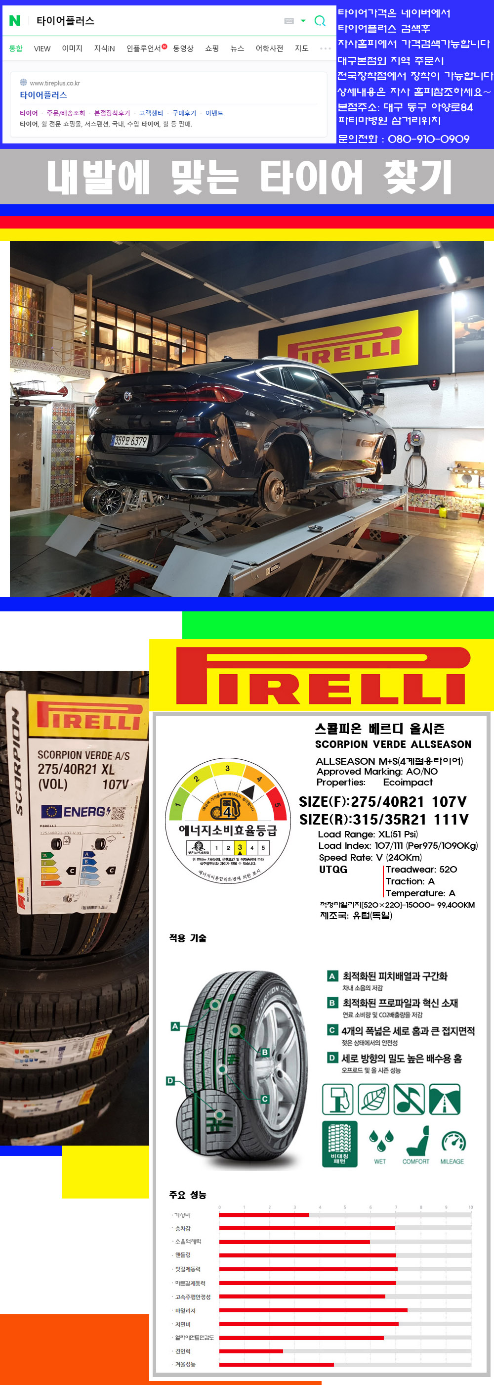 물론 한국 금호 넥센 브리지스톤 미쉐린 콘티넨탈 피렐리 던롭 굳이어 요코하마 등 세계유수의 10대 브랜드타이어만 취급하고 있습니다 타이어매장중 단일규모로는 아마 전국에서 제일 커지않을까 생각합니다 가격도 인터넷 최저가로 장착해 드리고 있습니다 고객님들이 오시면서 너무 고급스러워 가격도 비싸지 않을까 생각하시는데 네이버에서 타이어플러스사이트를 검색해보시면 가격 또한 정말 싸게 판매하고 있구나 하고 생각하실것입니다 물론 장비도 현존하는 장비중 가장 최신장비와 그리고 유럽풍 인테리어의 최고급매장입니다 무엇하나 정품만 취급하며 작업또한 꼼꼼하게 매뉴얼에 따라서 작업을 해드립니다 특히 사장님의 이력이 화려한데 자동차경주 레이스와 미캐닉 국제자격증(A)소지자로서 경험한 풍부한 자동차의 지식을 갖춘분이십니다 특히 자동차잡지사에 타이어에 관한 내용도 기재하신 분이며 타이어회사의 타이어테스트드라이브로도 참여한 분이십니다 제품의 품질이나 제품의 성능등을 장사수단으로 말하지 않고 있는 그대로 말해드리며 특히 사장님 성격상 거짓말을 못하는 성격이여서 믿고 맡겨주시면 후회하지 않을 것입니다 그래서 사장님께서 직접상담해주시고 장착도 해주시는 매장이기에 더 신뢰가 가지 않을까 생각합니다 자사는 인터넷 최저가 기반으로 성장한 회사이기에 가격또한 인터넷 최저가로 장착해 드리고 있습니다 그리고 자사는 고객만족도에서 대상까지 수상한 회사입니다 그래서 한번 저의 매장에서 작업하신 고객님은 아마 다른곳에서는 아마 눈에 차지 않을것이라 생각합니다 가격이면 가격 작업의 완성도면 완성도 그리고 사후 관리까지 최고중에 최고가 되기위해서 노력하는 매장입니다 지금까지 어느 매장에서도 느끼지 못한 감성들을 느끼시기를 바랍니다 감사합니다