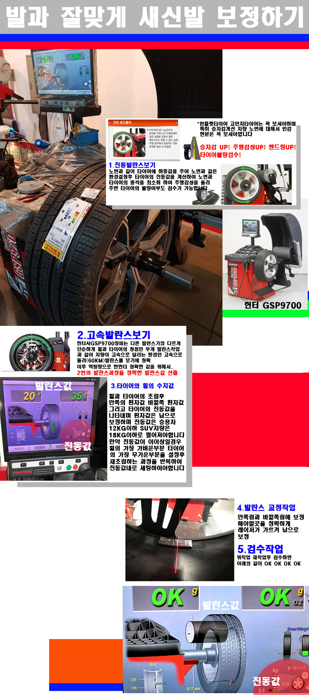 그리고 작업자에게는 불필요한 발란스납을 붙이지 않아 미관상으로 좋고 납을 절약하는 고객님에게도윈이고 작업자에게도 윈윈할수 있는 장비입니다 그리고 시중에서 고속진동발란스라고 말하시는 샵들이 많은데 꼭아셔야하는것은 고속발란스는 말그대로 발란스를 볼때 고속으로 돌리기에 60키로 전후 그리고 진동값을 계산하기위해서는 발란스기에 진동롤러가 있어야합니다 그래서 미국헌터사 GSP9700장비가 유일합니다 다른 샵에서 말하는 발란스기는 고속진동발란스기능없는 일반발란스 기기입니다 이점 꼭 아시고 장착하시기를 바랍니다