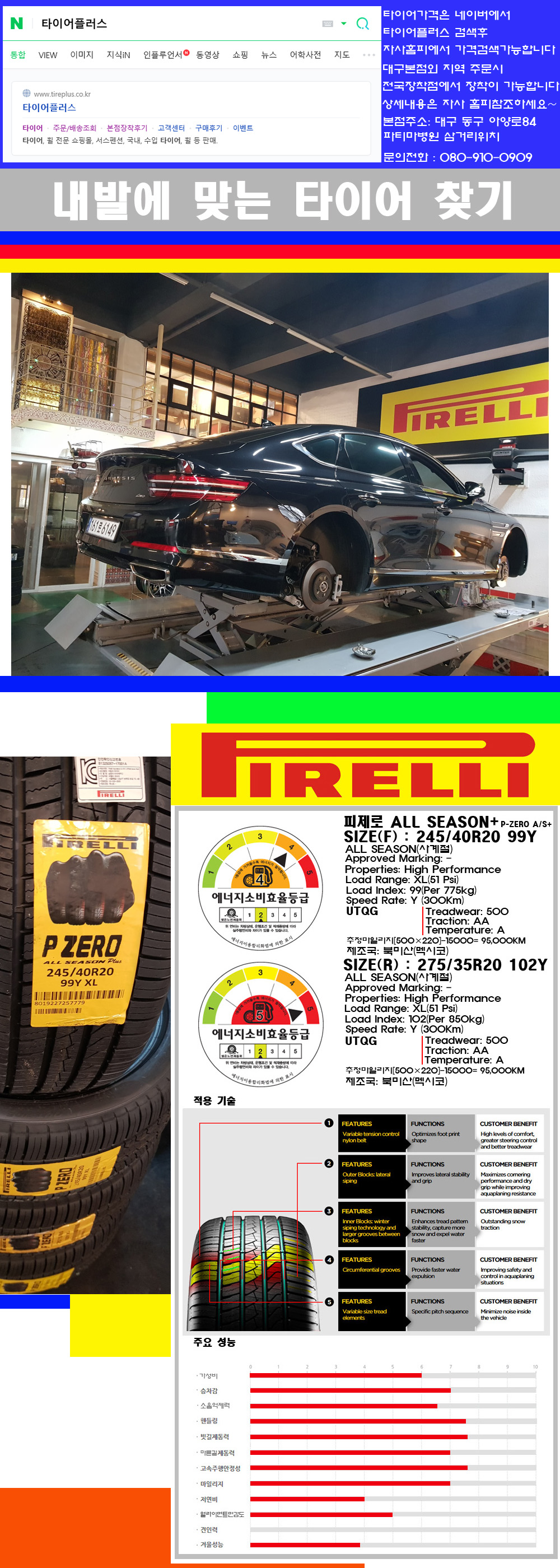 물론 한국 금호 넥센 브리지스톤 미쉐린 콘티넨탈 피렐리 던롭 굳이어 요코하마 등 세계유수의 10대 브랜드타이어만 취급하고 있습니다 타이어매장중 단일규모로는 아마 전국에서 제일 커지않을까 생각합니다 가격도 인터넷 최저가로 장착해 드리고 있습니다 고객님들이 오시면서 너무 고급스러워 가격도 비싸지 않을까 생각하시는데 네이버에서 타이어플러스사이트를 검색해보시면 가격 또한 정말 싸게 판매하고 있구나 하고 생각하실것입니다 물론 장비도 현존하는 장비중 가장 최신장비와 그리고 유럽풍 인테리어의 최고급매장입니다 무엇하나 정품만 취급하며 작업또한 꼼꼼하게 매뉴얼에 따라서 작업을 해드립니다 특히 사장님의 이력이 화려한데 자동차경주 레이스와 미캐닉 국제자격증(A)소지자로서 경험한 풍부한 자동차의 지식을 갖춘분이십니다 특히 자동차잡지사에 타이어에 관한 내용도 기재하신 분이며 타이어회사의 타이어테스트드라이브로도 참여한 분이십니다 제품의 품질이나 제품의 성능등을 장사수단으로 말하지 않고 있는 그대로 말해드리며 특히 사장님 성격상 거짓말을 못하는 성격이여서 믿고 맡겨주시면 후회하지 않을 것입니다 그래서 사장님께서 직접상담해주시고 장착도 해주시는 매장이기에 더 신뢰가 가지 않을까 생각합니다 자사는 인터넷 최저가 기반으로 성장한 회사이기에 가격또한 인터넷 최저가로 장착해 드리고 있습니다 그리고 자사는 고객만족도에서 대상까지 수상한 회사입니다 그래서 한번 저의 매장에서 작업하신 고객님은 아마 다른곳에서는 아마 눈에 차지 않을것이라 생각합니다 가격이면 가격 작업의 완성도면 완성도 그리고 사후 관리까지 최고중에 최고가 되기위해서 노력하는 매장입니다 지금까지 어느 매장에서도 느끼지 못한 감성들을 느끼시기를 바랍니다 감사합니다