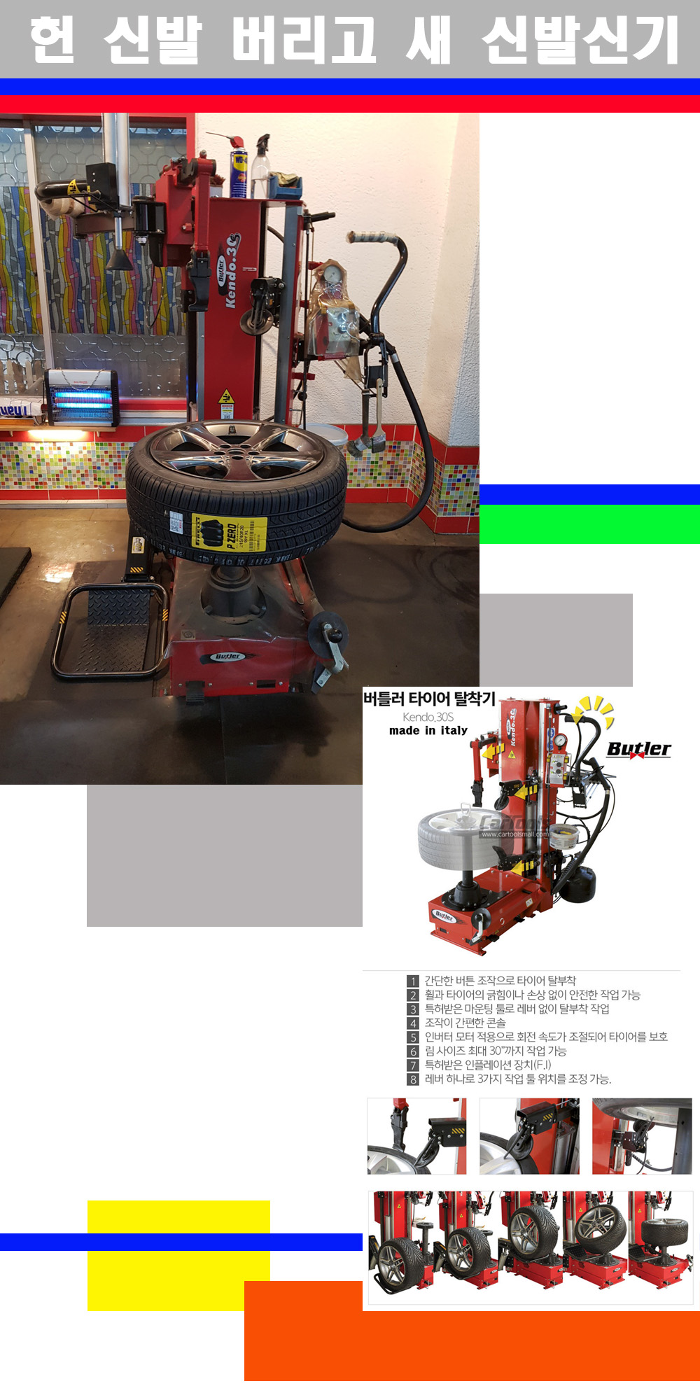 이태리 버틀러사의 켄도3.0S는 휠과 타이어와 조립과 분리시 전혀 제품에 손상을 주지않는 탈착기로 특히 센터락방식(중앙에서 휠를 고정하는 방식)이여서 휠의 중앙부위 잡아서 타이어를 탈부착하고 이후 상하롤러로 타이어를 탈부착합니다 특히 유니포미티작업(휠의 가장가벼운부분과 타이어의 가장 무거운부분을 매칭시키는 작업)시 작업자가 타이어를 정확한 지점에 휠과 매칭시킬수 있는 장점도 있습니다