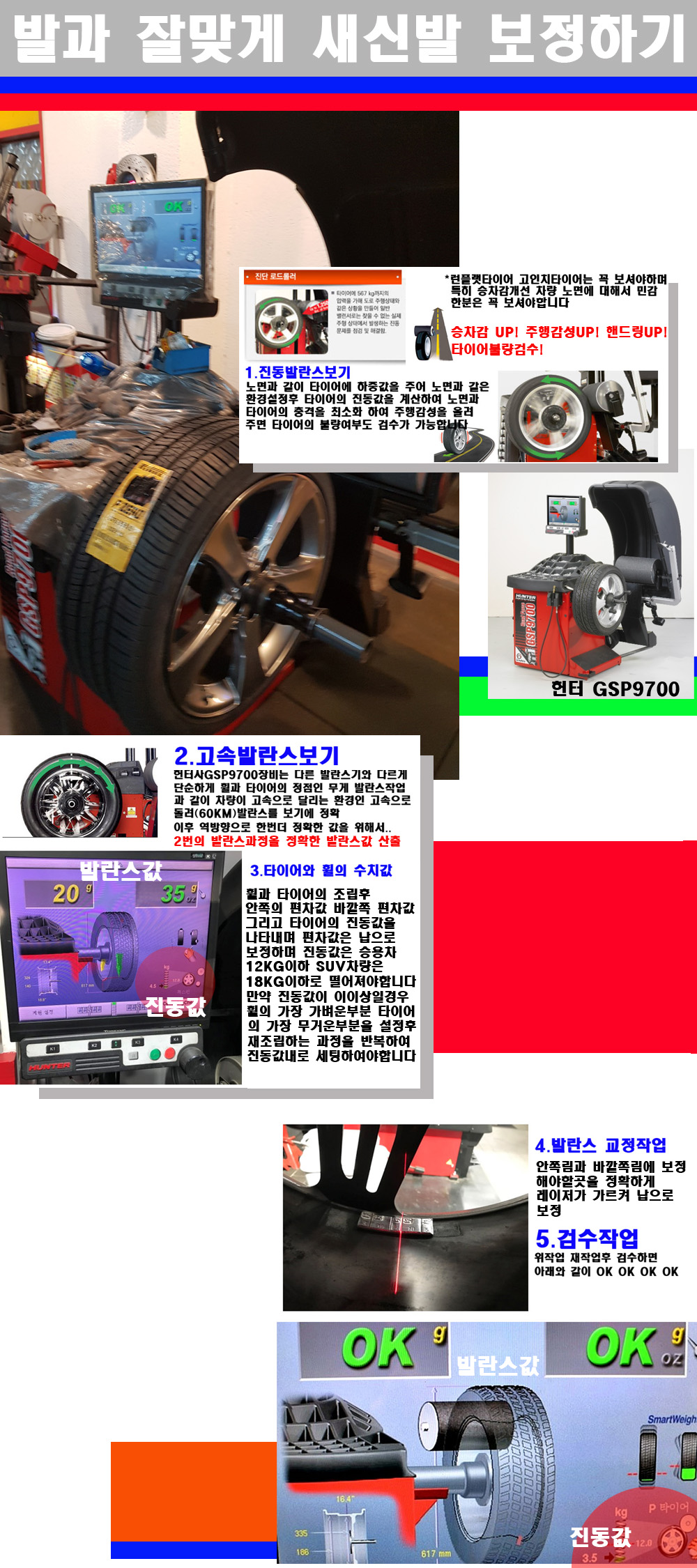 그리고 작업자에게는 불필요한 발란스납을 붙이지 않아 미관상으로 좋고 납을 절약하는 고객님에게도윈이고 작업자에게도 윈윈할수 있는 장비입니다 그리고 시중에서 고속진동발란스라고 말하시는 샵들이 많은데 꼭아셔야하는것은 고속발란스는 말그대로 발란스를 볼때 고속으로 돌리기에 60키로 전후 그리고 진동값을 계산하기위해서는 발란스기에 진동롤러가 있어야합니다 그래서 미국헌터사 GSP9700장비가 유일합니다 다른 샵에서 말하는 발란스기는 고속진동발란스기능없는 일반발란스 기기입니다 이점 꼭 아시고 장착하시기를 바랍니다