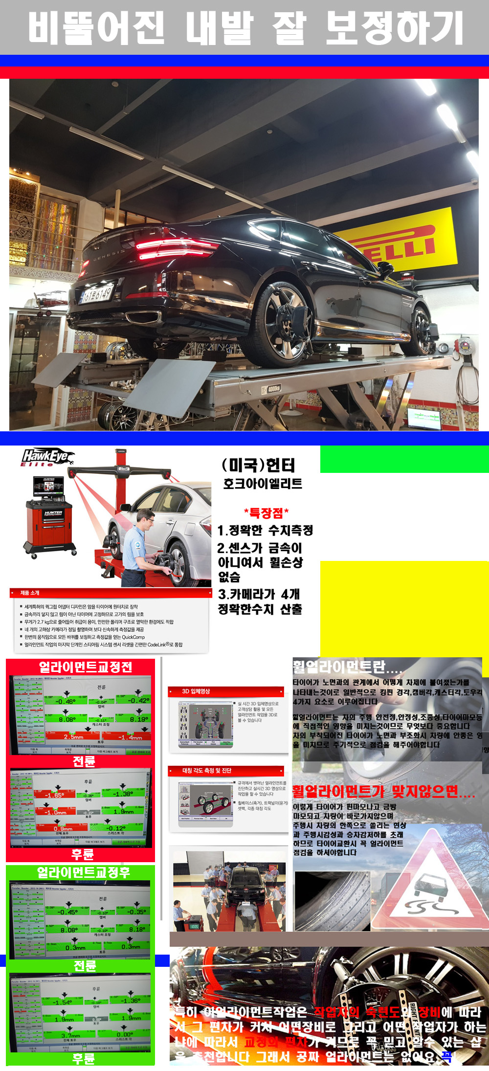 자사는 얼라이먼트정렬시 교정전 교정후를 구분하여 고객님께 직접 이수치값을 확인시켜드리고 작업을 하며 이후 각각의 특성을 가진 타이어들에 대해서 설명 및 관리요령 운전요령 같이 설명해드리고 있습니다
