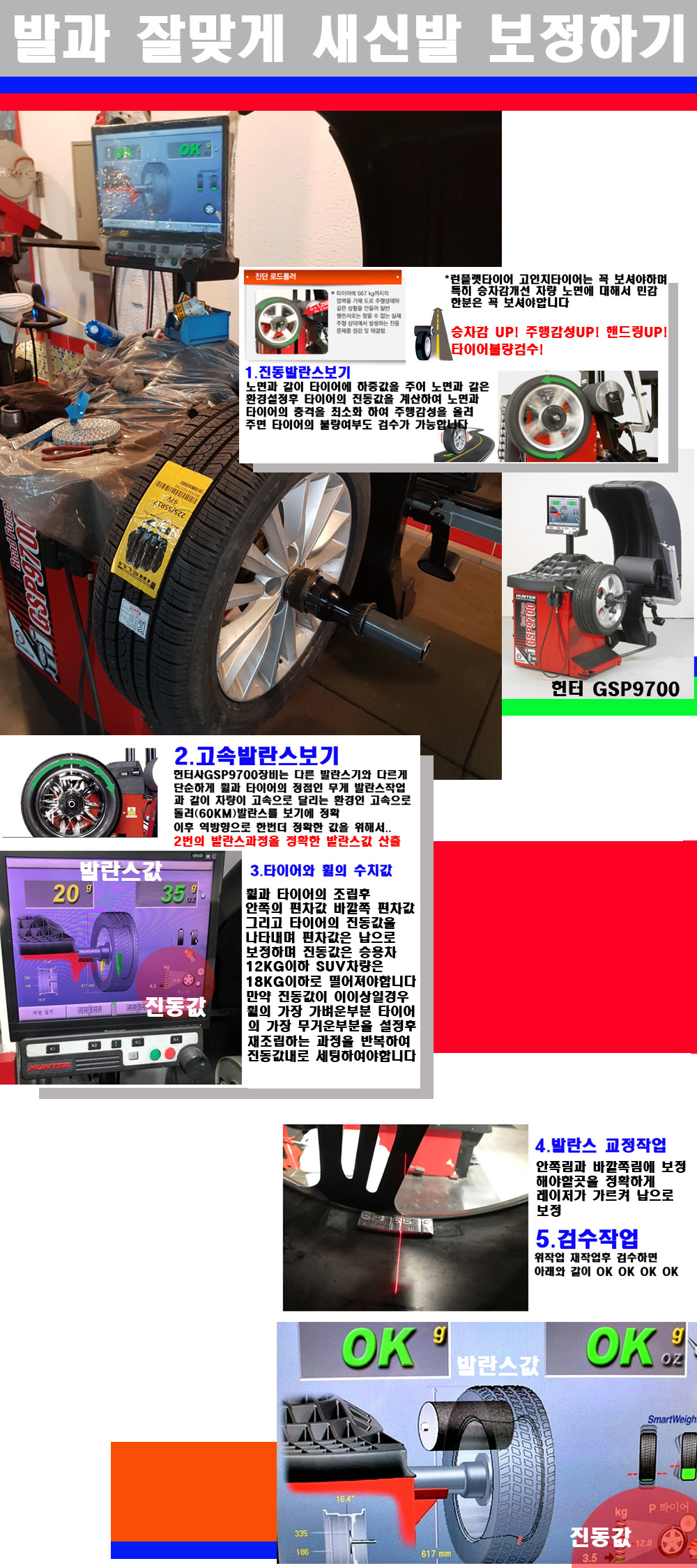 그리고 작업자에게는 불필요한 발란스납을 붙이지 않아 미관상으로 좋고 납을 절약하는 고객님에게도윈이고 작업자에게도 윈윈할수 있는 장비입니다 그리고 시중에서 고속진동발란스라고 말하시는 샵들이 많은데 꼭아셔야하는것은 고속발란스는 말그대로 발란스를 볼때 고속으로 돌리기에 60키로 전후 그리고 진동값을 계산하기위해서는 발란스기에 진동롤러가 있어야합니다 그래서 미국헌터사 GSP9700장비가 유일합니다 다른 샵에서 말하는 발란스기는 고속진동발란스기능없는 일반발란스 기기입니다 이점 꼭 아시고 장착하시기를 바랍니다