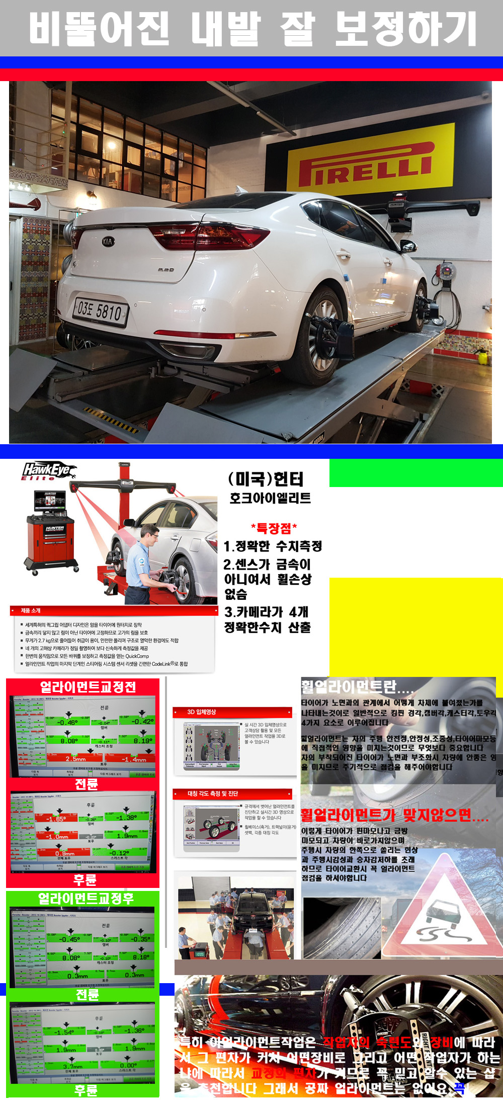자사는 얼라이먼트정렬시 교정전 교정후를 구분하여 고객님께 직접 이수치값을 확인시켜드리고 작업을 하며 이후 각각의 특성을 가진 타이어들에 대해서 설명 및 관리요령 운전요령 같이 설명해드리고 있습니다