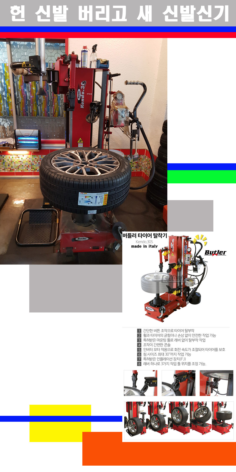 이태리 버틀러사의 켄도3.0S는 휠과 타이어와 조립과 분리시 전혀 제품에 손상을 주지않는 탈착기로 특히 센터락방식(중앙에서 휠를 고정하는 방식)이여서 휠의 중앙부위 잡아서 타이어를 탈부착하고 이후 상하롤러로 타이어를 탈부착합니다 특히 유니포미티작업(휠의 가장가벼운부분과 타이어의 가장 무거운부분을 매칭시키는 작업)시 작업자가 타이어를 정확한 지점에 휠과 매칭시킬수 있는 장점도 있습니다