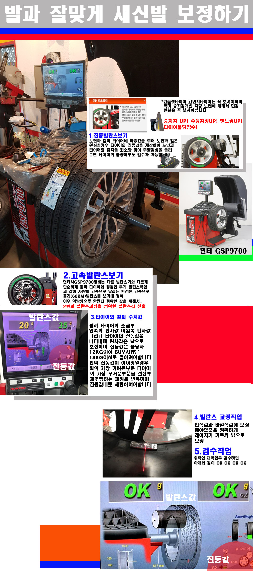 그리고 작업자에게는 불필요한 발란스납을 붙이지 않아 미관상으로 좋고 납을 절약하는 고객님에게도윈이고 작업자에게도 윈윈할수 있는 장비입니다 그리고 시중에서 고속진동발란스라고 말하시는 샵들이 많은데 꼭아셔야하는것은 고속발란스는 말그대로 발란스를 볼때 고속으로 돌리기에 60키로 전후 그리고 진동값을 계산하기위해서는 발란스기에 진동롤러가 있어야합니다 그래서 미국헌터사 GSP9700장비가 유일합니다 다른 샵에서 말하는 발란스기는 고속진동발란스기능없는 일반발란스 기기입니다 이점 꼭 아시고 장착하시기를 바랍니다