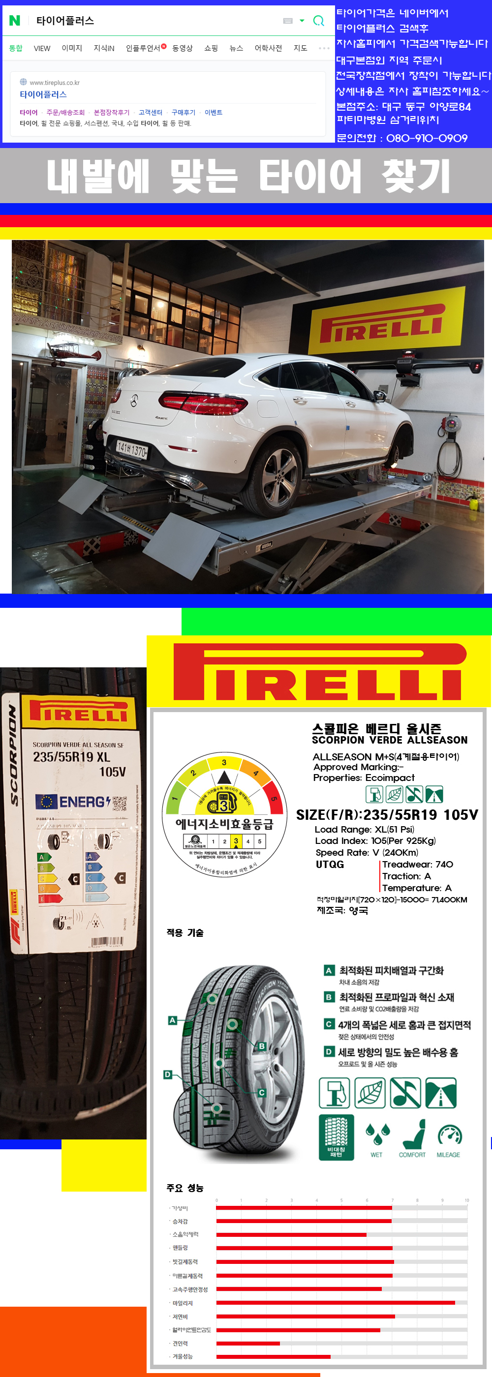 물론 한국 금호 넥센 브리지스톤 미쉐린 콘티넨탈 피렐리 던롭 굳이어 요코하마 등 세계유수의 10대 브랜드타이어만 취급하고 있습니다 타이어매장중 단일규모로는 아마 전국에서 제일 커지않을까 생각합니다 가격도 인터넷 최저가로 장착해 드리고 있습니다 고객님들이 오시면서 너무 고급스러워 가격도 비싸지 않을까 생각하시는데 네이버에서 타이어플러스사이트를 검색해보시면 가격 또한 정말 싸게 판매하고 있구나 하고 생각하실것입니다 물론 장비도 현존하는 장비중 가장 최신장비와 그리고 유럽풍 인테리어의 최고급매장입니다 무엇하나 정품만 취급하며 작업또한 꼼꼼하게 매뉴얼에 따라서 작업을 해드립니다 특히 사장님의 이력이 화려한데 자동차경주 레이스와 미캐닉 국제자격증(A)소지자로서 경험한 풍부한 자동차의 지식을 갖춘분이십니다 특히 자동차잡지사에 타이어에 관한 내용도 기재하신 분이며 타이어회사의 타이어테스트드라이브로도 참여한 분이십니다 제품의 품질이나 제품의 성능등을 장사수단으로 말하지 않고 있는 그대로 말해드리며 특히 사장님 성격상 거짓말을 못하는 성격이여서 믿고 맡겨주시면 후회하지 않을 것입니다 그래서 사장님께서 직접상담해주시고 장착도 해주시는 매장이기에 더 신뢰가 가지 않을까 생각합니다 자사는 인터넷 최저가 기반으로 성장한 회사이기에 가격또한 인터넷 최저가로 장착해 드리고 있습니다 그리고 자사는 고객만족도에서 대상까지 수상한 회사입니다 그래서 한번 저의 매장에서 작업하신 고객님은 아마 다른곳에서는 아마 눈에 차지 않을것이라 생각합니다 가격이면 가격 작업의 완성도면 완성도 그리고 사후 관리까지 최고중에 최고가 되기위해서 노력하는 매장입니다 지금까지 어느 매장에서도 느끼지 못한 감성들을 느끼시기를 바랍니다 감사합니다