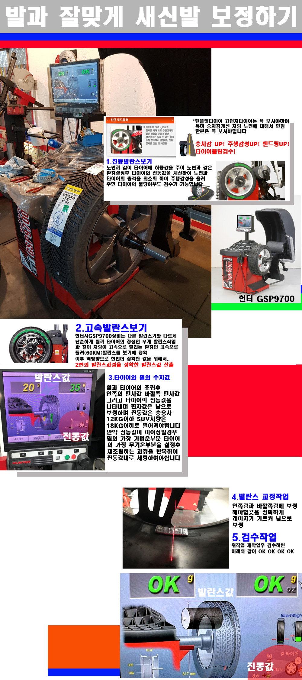 그리고 작업자에게는 불필요한 발란스납을 붙이지 않아 미관상으로 좋고 납을 절약하는 고객님에게도윈이고 작업자에게도 윈윈할수 있는 장비입니다 그리고 시중에서 고속진동발란스라고 말하시는 샵들이 많은데 꼭아셔야하는것은 고속발란스는 말그대로 발란스를 볼때 고속으로 돌리기에 60키로 전후 그리고 진동값을 계산하기위해서는 발란스기에 진동롤러가 있어야합니다 그래서 미국헌터사 GSP9700장비가 유일합니다 다른 샵에서 말하는 발란스기는 고속진동발란스기능없는 일반발란스 기기입니다 이점 꼭 아시고 장착하시기를 바랍니다