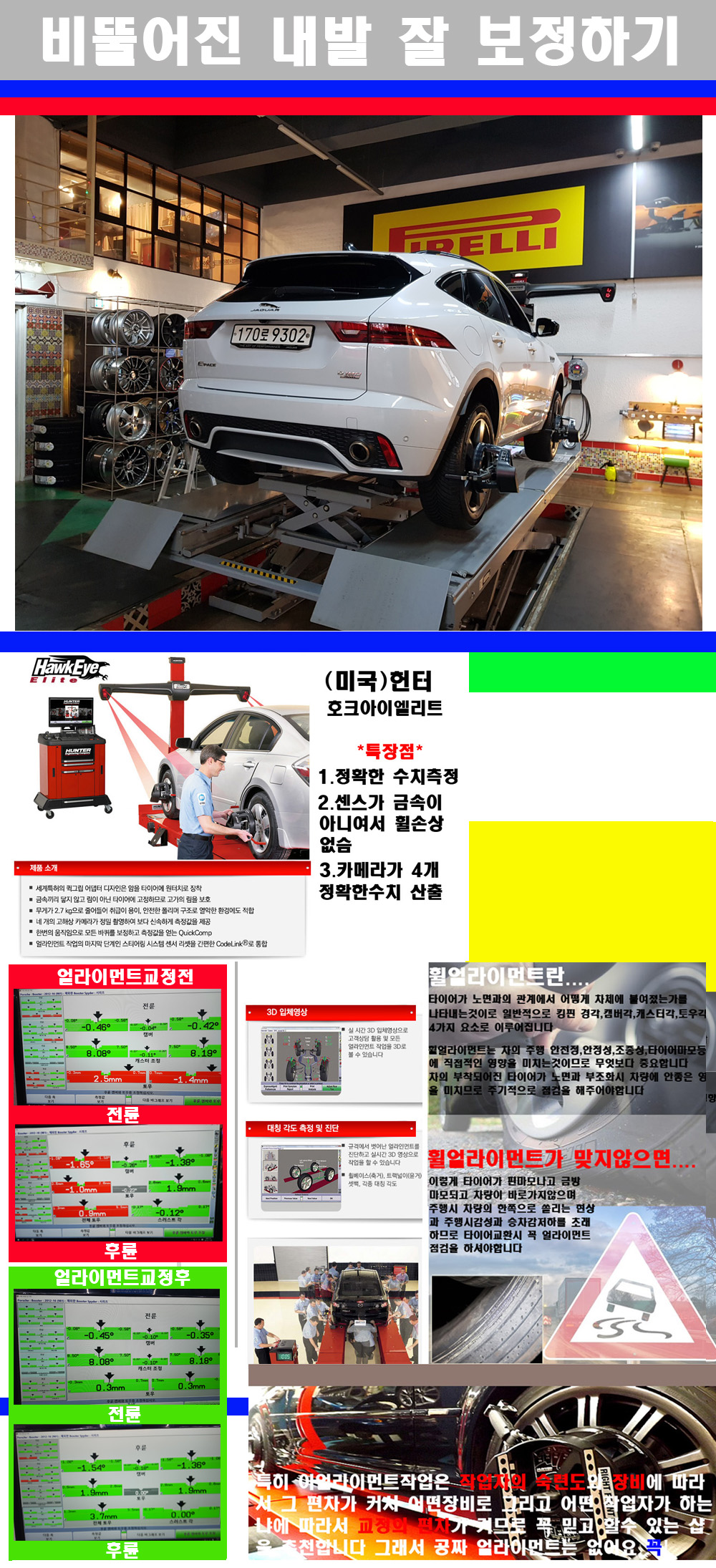 자사는 얼라이먼트정렬시 교정전 교정후를 구분하여 고객님께 직접 이수치값을 확인시켜드리고 작업을 하며 이후 각각의 특성을 가진 타이어들에 대해서 설명 및 관리요령 운전요령 같이 설명해드리고 있습니다