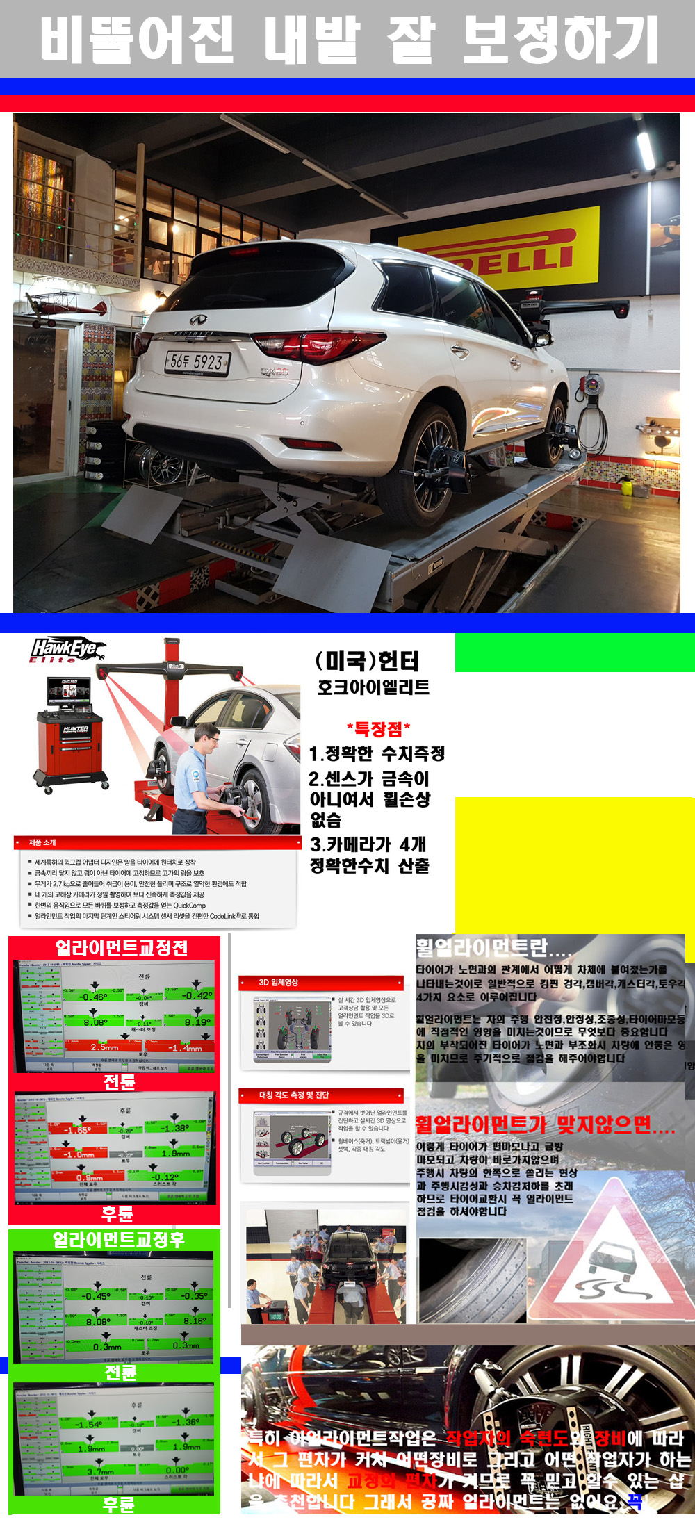 자사는 얼라이먼트정렬시 교정전 교정후를 구분하여 고객님께 직접 이수치값을 확인시켜드리고 작업을 하며 이후 각각의 특성을 가진 타이어들에 대해서 설명 및 관리요령 운전요령 같이 설명해드리고 있습니다
