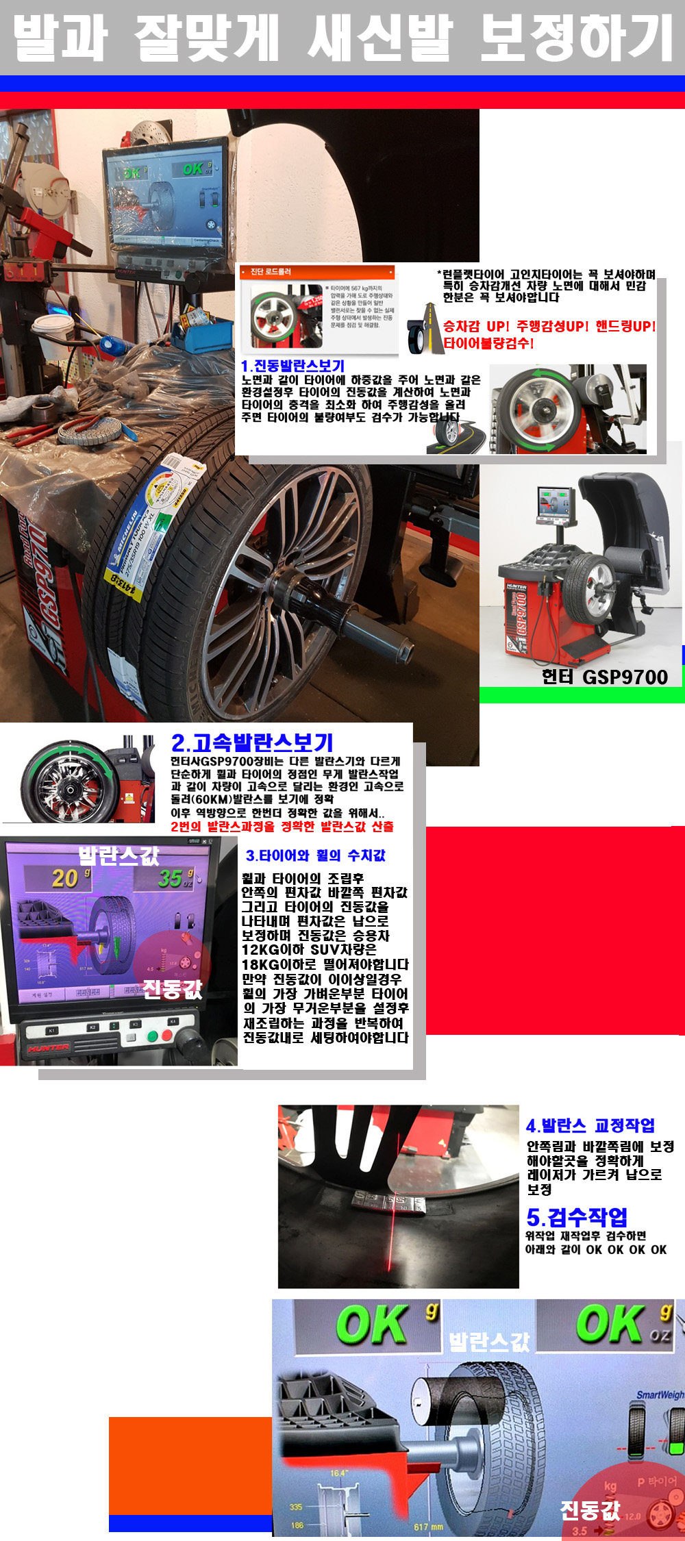 그리고 작업자에게는 불필요한 발란스납을 붙이지 않아 미관상으로 좋고 납을 절약하는 고객님에게도윈이고 작업자에게도 윈윈할수 있는 장비입니다 그리고 시중에서 고속진동발란스라고 말하시는 샵들이 많은데 꼭아셔야하는것은 고속발란스는 말그대로 발란스를 볼때 고속으로 돌리기에 60키로 전후 그리고 진동값을 계산하기위해서는 발란스기에 진동롤러가 있어야합니다 그래서 미국헌터사 GSP9700장비가 유일합니다 다른 샵에서 말하는 발란스기는 고속진동발란스기능없는 일반발란스 기기입니다 이점 꼭 아시고 장착하시기를 바랍니다