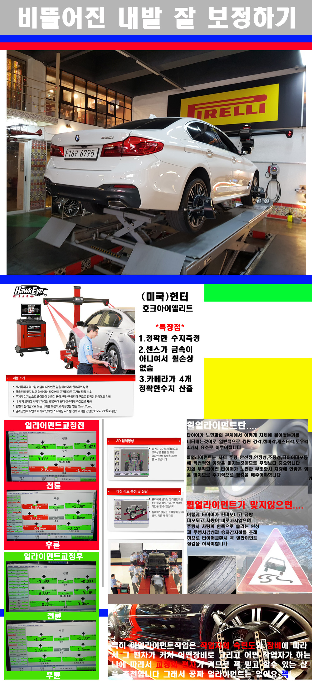 자사는 얼라이먼트정렬시 교정전 교정후를 구분하여 고객님께 직접 이수치값을 확인시켜드리고 작업을 하며 이후 각각의 특성을 가진 타이어들에 대해서 설명 및 관리요령 운전요령 같이 설명해드리고 있습니다
