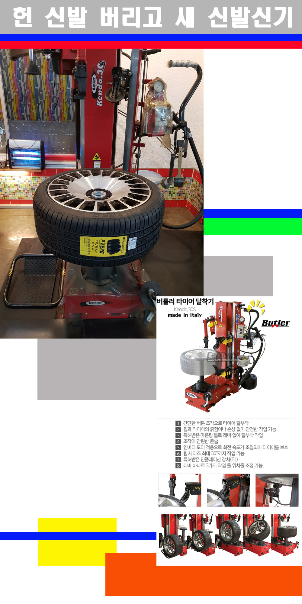 이태리 버틀러사의 켄도3.0S는 휠과 타이어와 조립과 분리시 전혀 제품에 손상을 주지않는 탈착기로 특히 센터락방식(중앙에서 휠를 고정하는 방식)이여서 휠의 중앙부위 잡아서 타이어를 탈부착하고 이후 상하롤러로 타이어를 탈부착합니다 특히 유니포미티작업(휠의 가장가벼운부분과 타이어의 가장 무거운부분을 매칭시키는 작업)시 작업자가 타이어를 정확한 지점에 휠과 매칭시킬수 있는 장점도 있습니다