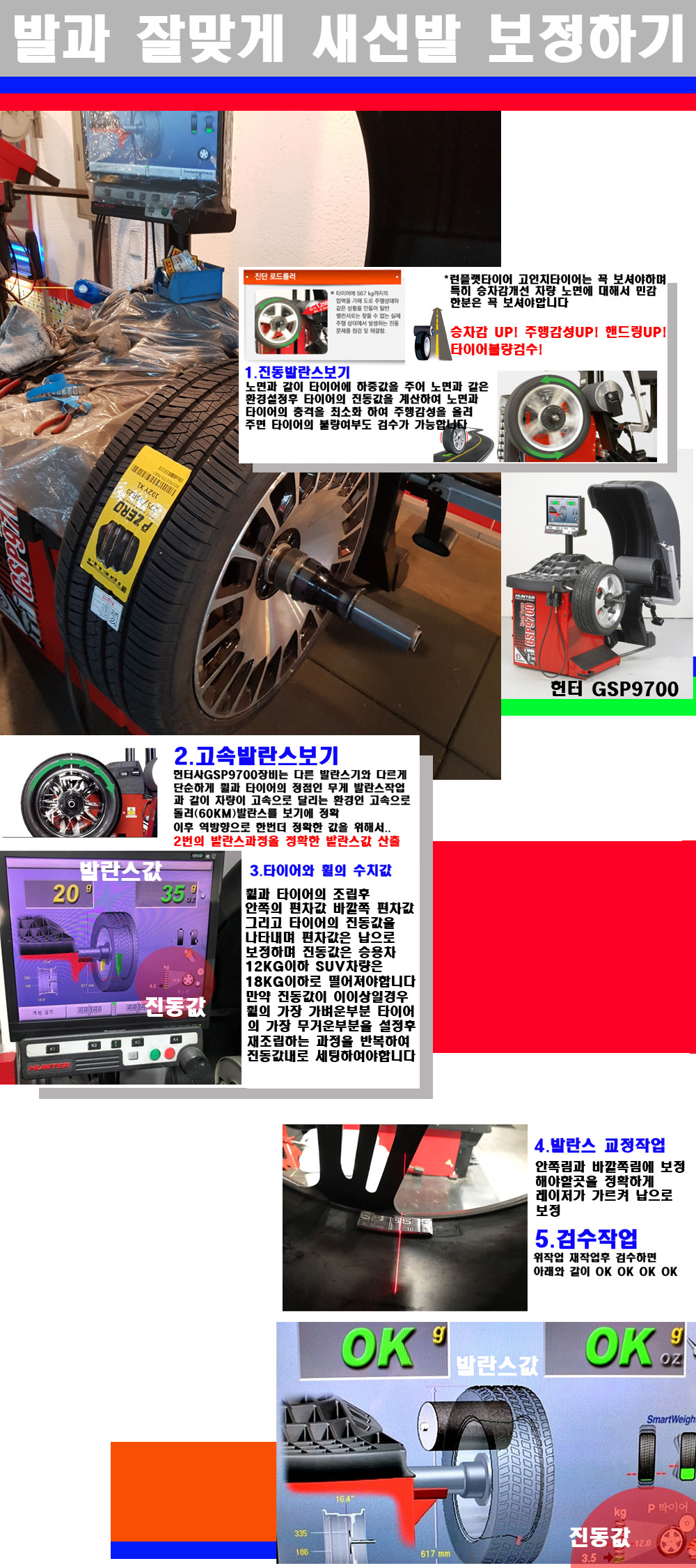 그리고 작업자에게는 불필요한 발란스납을 붙이지 않아 미관상으로 좋고 납을 절약하는 고객님에게도윈이고 작업자에게도 윈윈할수 있는 장비입니다 그리고 시중에서 고속진동발란스라고 말하시는 샵들이 많은데 꼭아셔야하는것은 고속발란스는 말그대로 발란스를 볼때 고속으로 돌리기에 60키로 전후 그리고 진동값을 계산하기위해서는 발란스기에 진동롤러가 있어야합니다 그래서 미국헌터사 GSP9700장비가 유일합니다 다른 샵에서 말하는 발란스기는 고속진동발란스기능없는 일반발란스 기기입니다 이점 꼭 아시고 장착하시기를 바랍니다