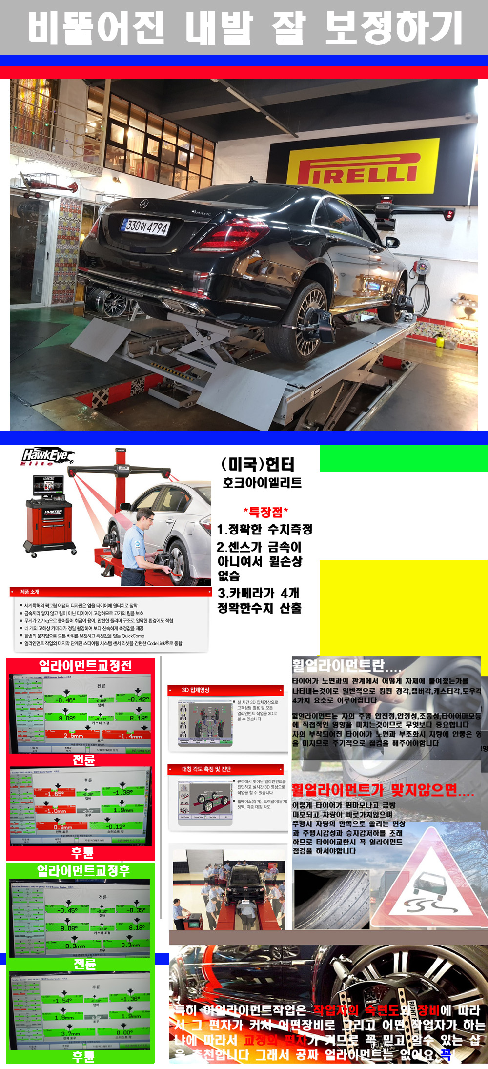 자사는 얼라이먼트정렬시 교정전 교정후를 구분하여 고객님께 직접 이수치값을 확인시켜드리고 작업을 하며 이후 각각의 특성을 가진 타이어들에 대해서 설명 및 관리요령 운전요령 같이 설명해드리고 있습니다