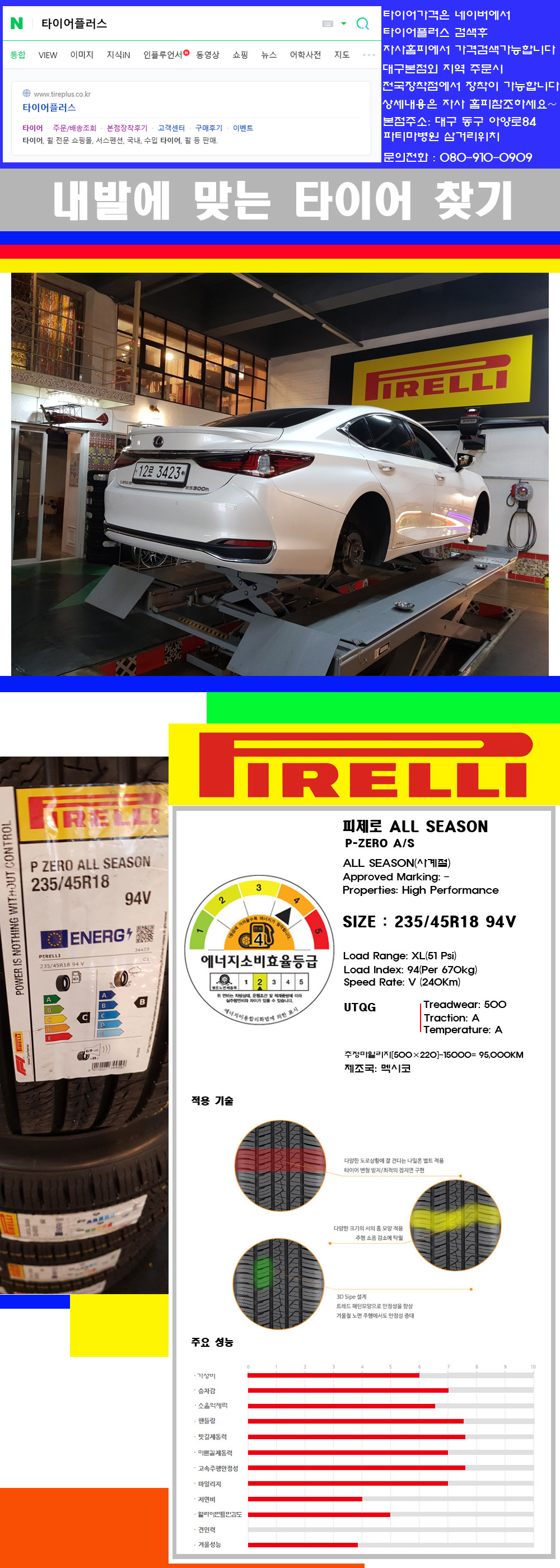 물론 한국 금호 넥센 브리지스톤 미쉐린 콘티넨탈 피렐리 던롭 굳이어 요코하마 등 세계유수의 10대 브랜드타이어만 취급하고 있습니다 타이어매장중 단일규모로는 아마 전국에서 제일 커지않을까 생각합니다 가격도 인터넷 최저가로 장착해 드리고 있습니다 고객님들이 오시면서 너무 고급스러워 가격도 비싸지 않을까 생각하시는데 네이버에서 타이어플러스사이트를 검색해보시면 가격 또한 정말 싸게 판매하고 있구나 하고 생각하실것입니다 물론 장비도 현존하는 장비중 가장 최신장비와 그리고 유럽풍 인테리어의 최고급매장입니다 무엇하나 정품만 취급하며 작업또한 꼼꼼하게 매뉴얼에 따라서 작업을 해드립니다 특히 사장님의 이력이 화려한데 자동차경주 레이스와 미캐닉 국제자격증(A)소지자로서 경험한 풍부한 자동차의 지식을 갖춘분이십니다 특히 자동차잡지사에 타이어에 관한 내용도 기재하신 분이며 타이어회사의 타이어테스트드라이브로도 참여한 분이십니다 제품의 품질이나 제품의 성능등을 장사수단으로 말하지 않고 있는 그대로 말해드리며 특히 사장님 성격상 거짓말을 못하는 성격이여서 믿고 맡겨주시면 후회하지 않을 것입니다 그래서 사장님께서 직접상담해주시고 장착도 해주시는 매장이기에 더 신뢰가 가지 않을까 생각합니다 자사는 인터넷 최저가 기반으로 성장한 회사이기에 가격또한 인터넷 최저가로 장착해 드리고 있습니다 그리고 자사는 고객만족도에서 대상까지 수상한 회사입니다 그래서 한번 저의 매장에서 작업하신 고객님은 아마 다른곳에서는 아마 눈에 차지 않을것이라 생각합니다 가격이면 가격 작업의 완성도면 완성도 그리고 사후 관리까지 최고중에 최고가 되기위해서 노력하는 매장입니다 지금까지 어느 매장에서도 느끼지 못한 감성들을 느끼시기를 바랍니다 감사합니다